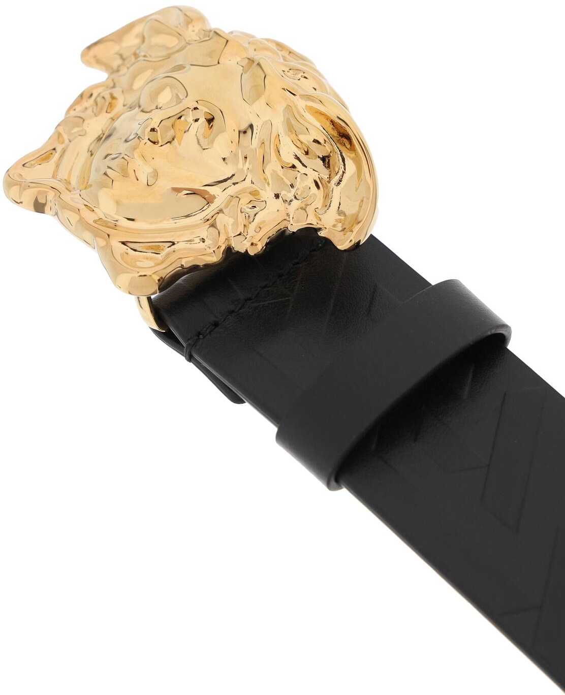 Verace leather belt with Greca motiv all-over and gold metal Medua buckle. The item in photo is size 100.