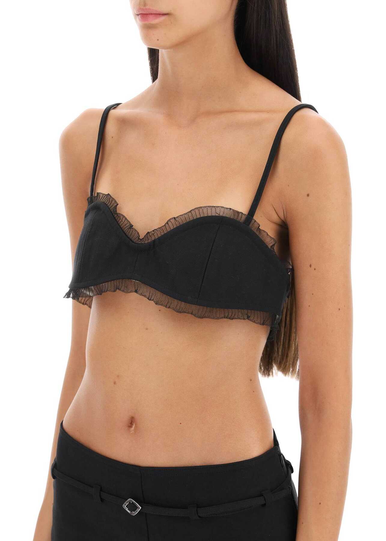 Ganni bra crafted in organic cotton and enriched by thin fishnet knit tonal trims. It features thin straps and back zipper closure. Lined in contrasting logo fabric on the inside. The model is 177 cm tall and wears size EU 36.