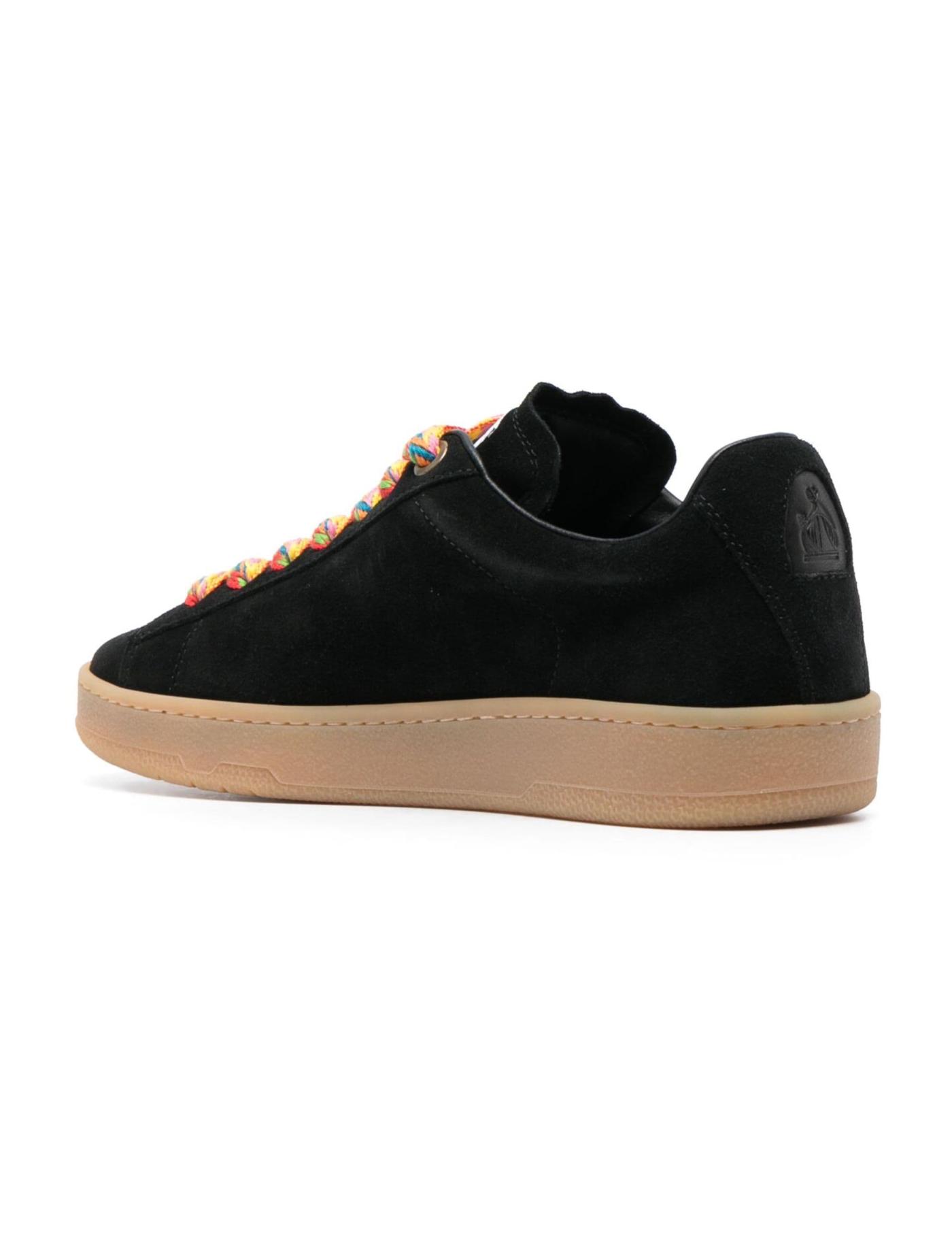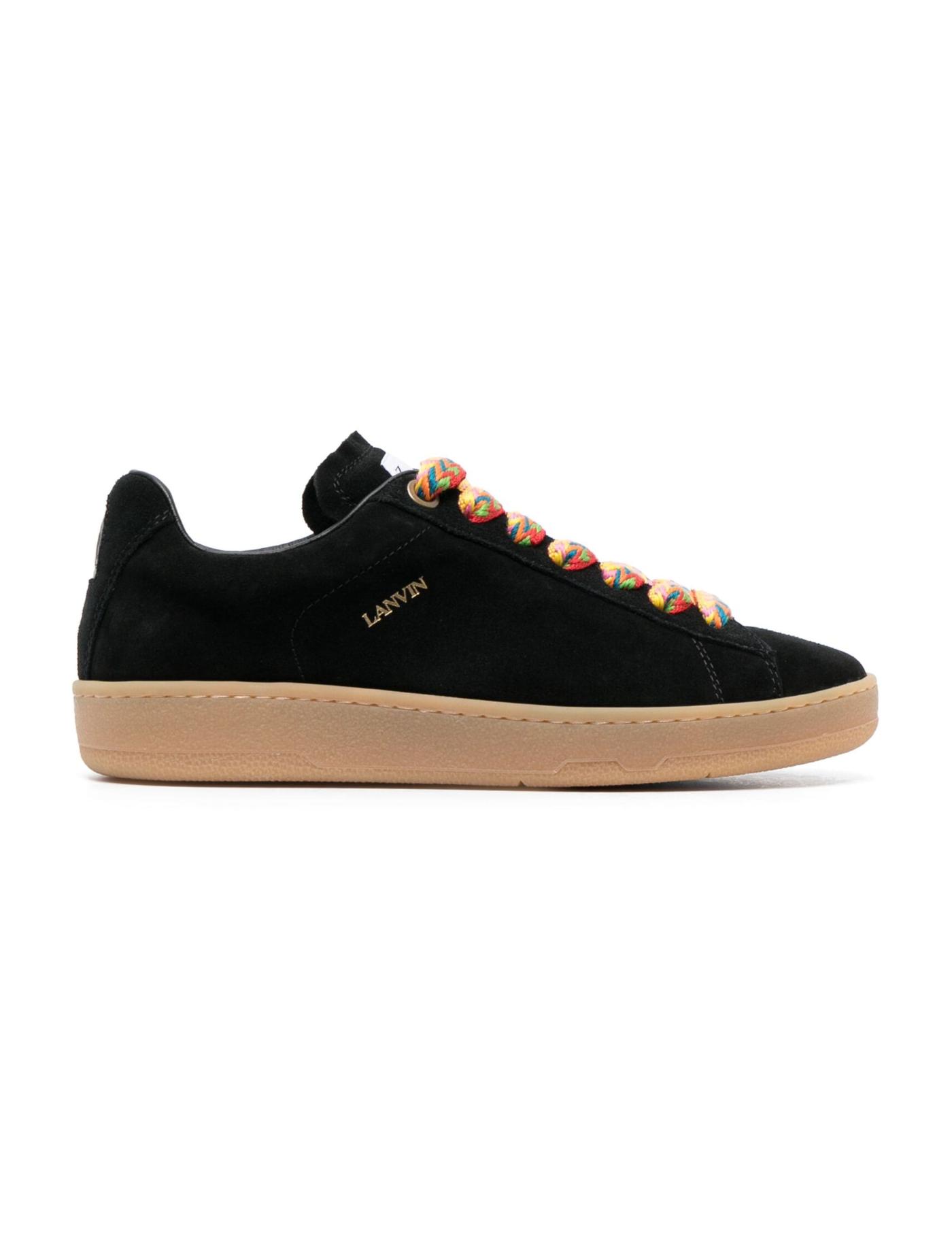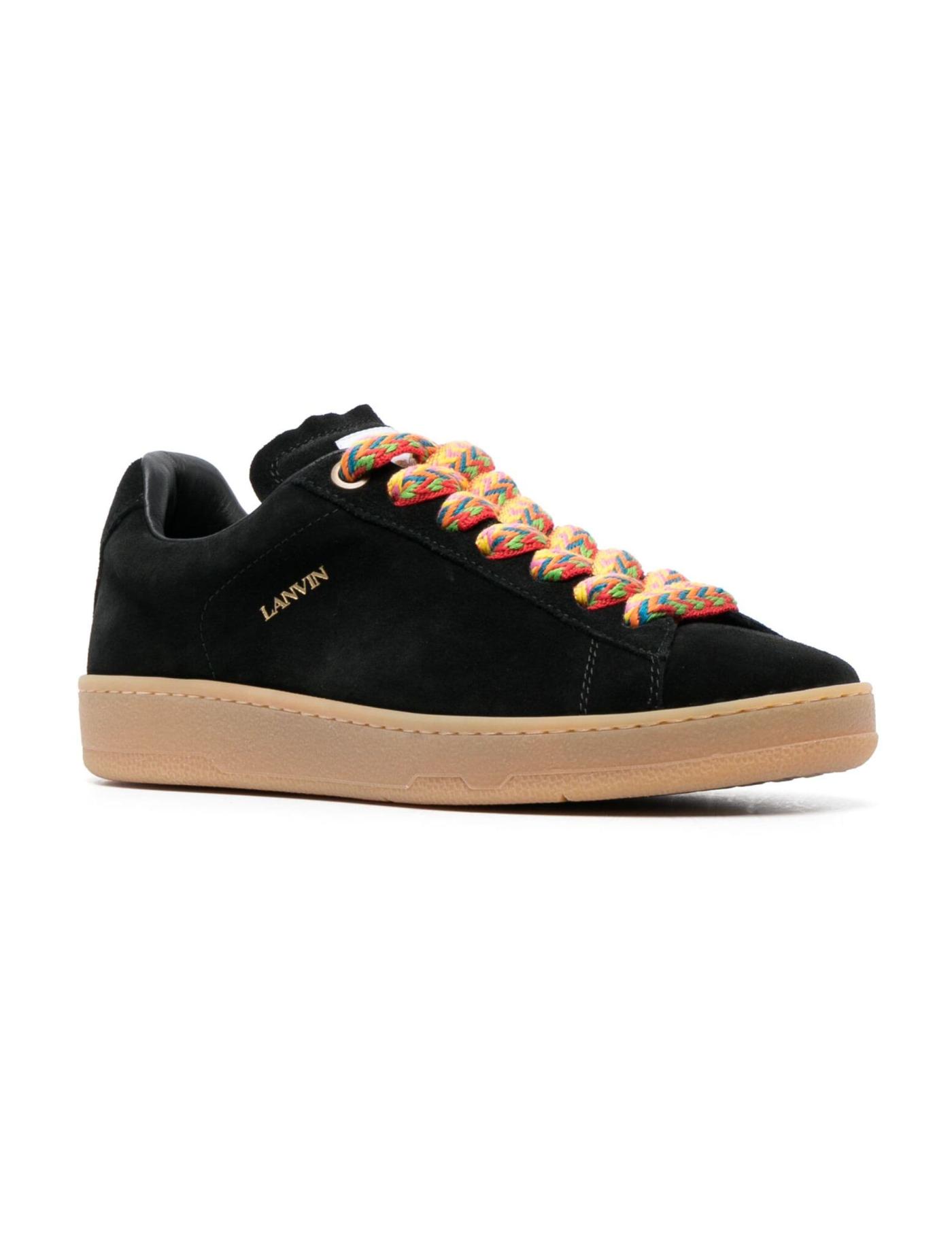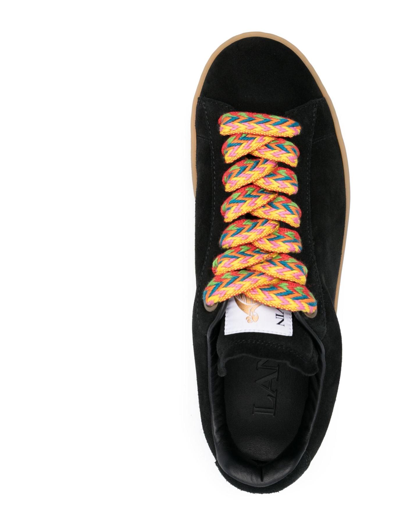 Lanvin's Lite Curb sneakers riff on by vintage skate styles with their signature oversized and kaleidoscopic chevron laces and rounded silhouette. This pair is made from supple black suede with contrasting rubber soles and Mother and Child logo patches at the tongues.