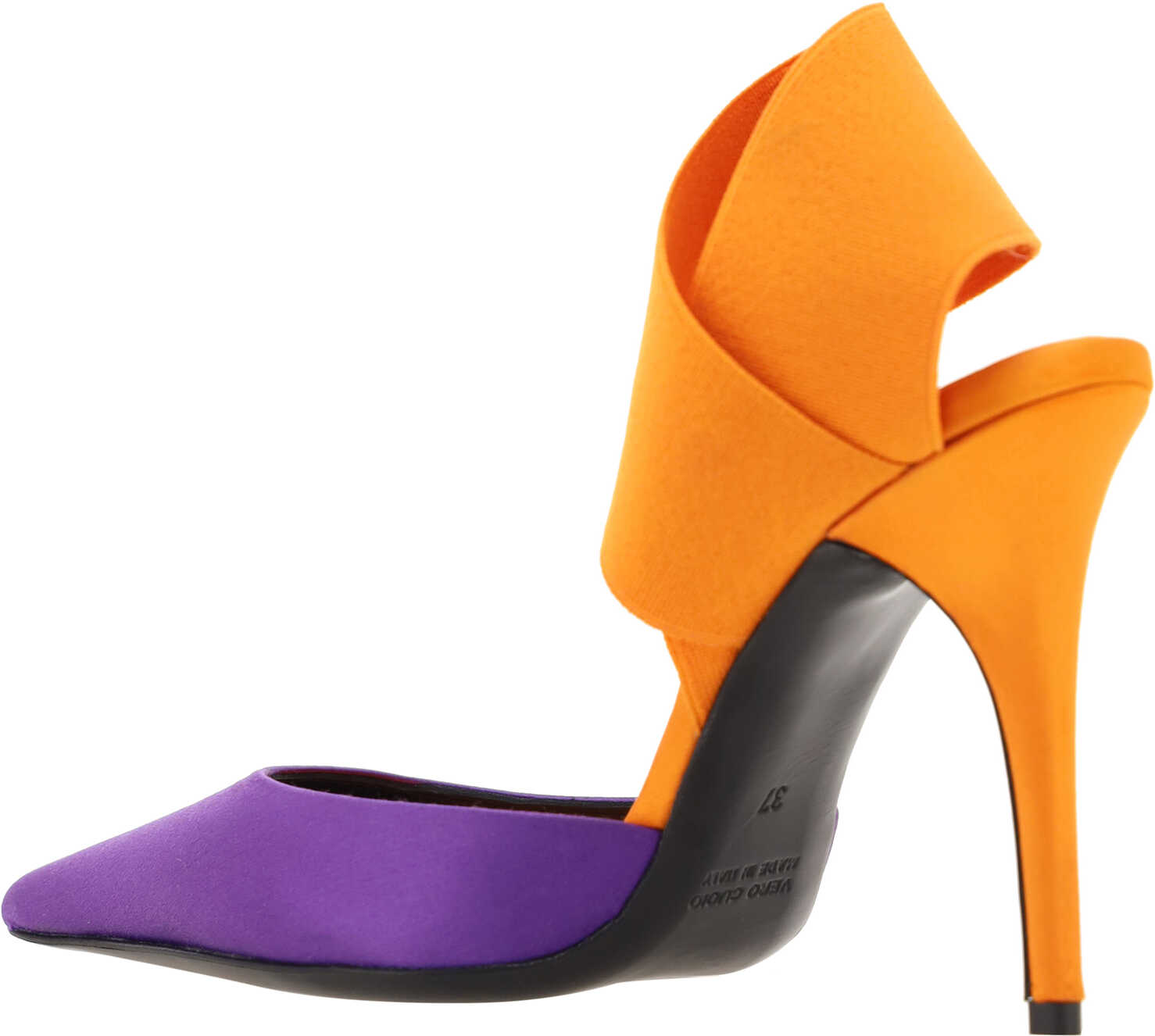 Calfskin N'Roll Pumps by Bruno Frisoni, patent leather finish, a geometric toe, a two-tone panelled design, a leather stiletto heel, an ankle strap made from elasticated webing, and a logo-embossed insole.