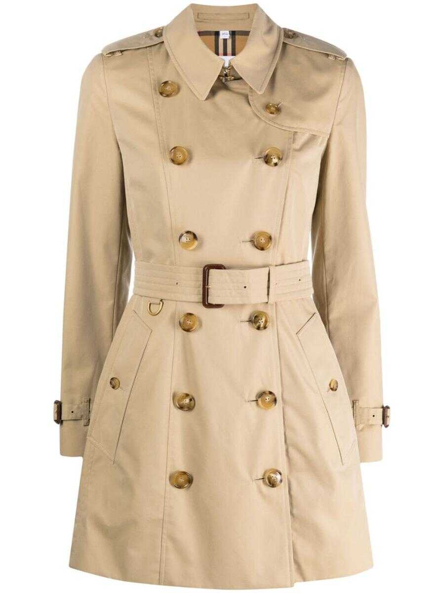 Short trench coat from BURBERRY featuring gabardine weave, epaulettes, storm flap, classic collar, double-breasted button fastening, belted waist, two button-fastening pockets, long sleeves, belted cuffs, thigh-length and camel beige. This piece fits true to size. We recommend you get your regular size