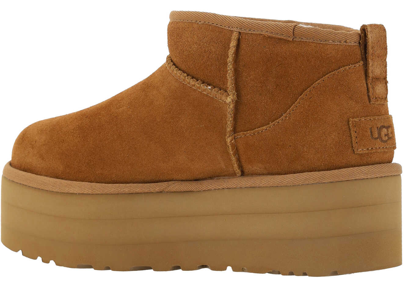Calfskin Classic Ultra Mini Platform Boots by UGG, knurled platform sound, round toe, soft shearling lining, iconic brand monogram applied to heel, raised stitching, suede design.