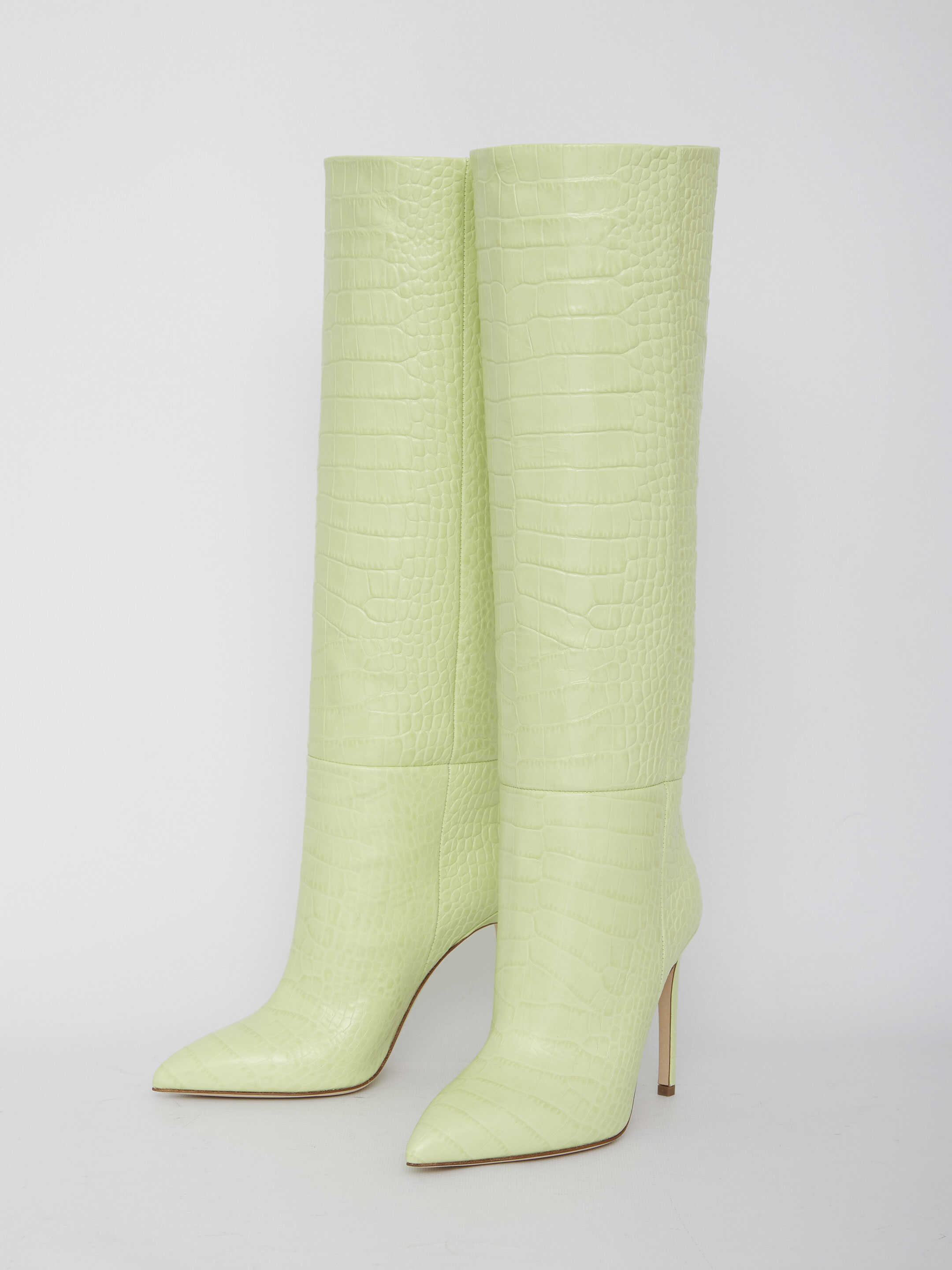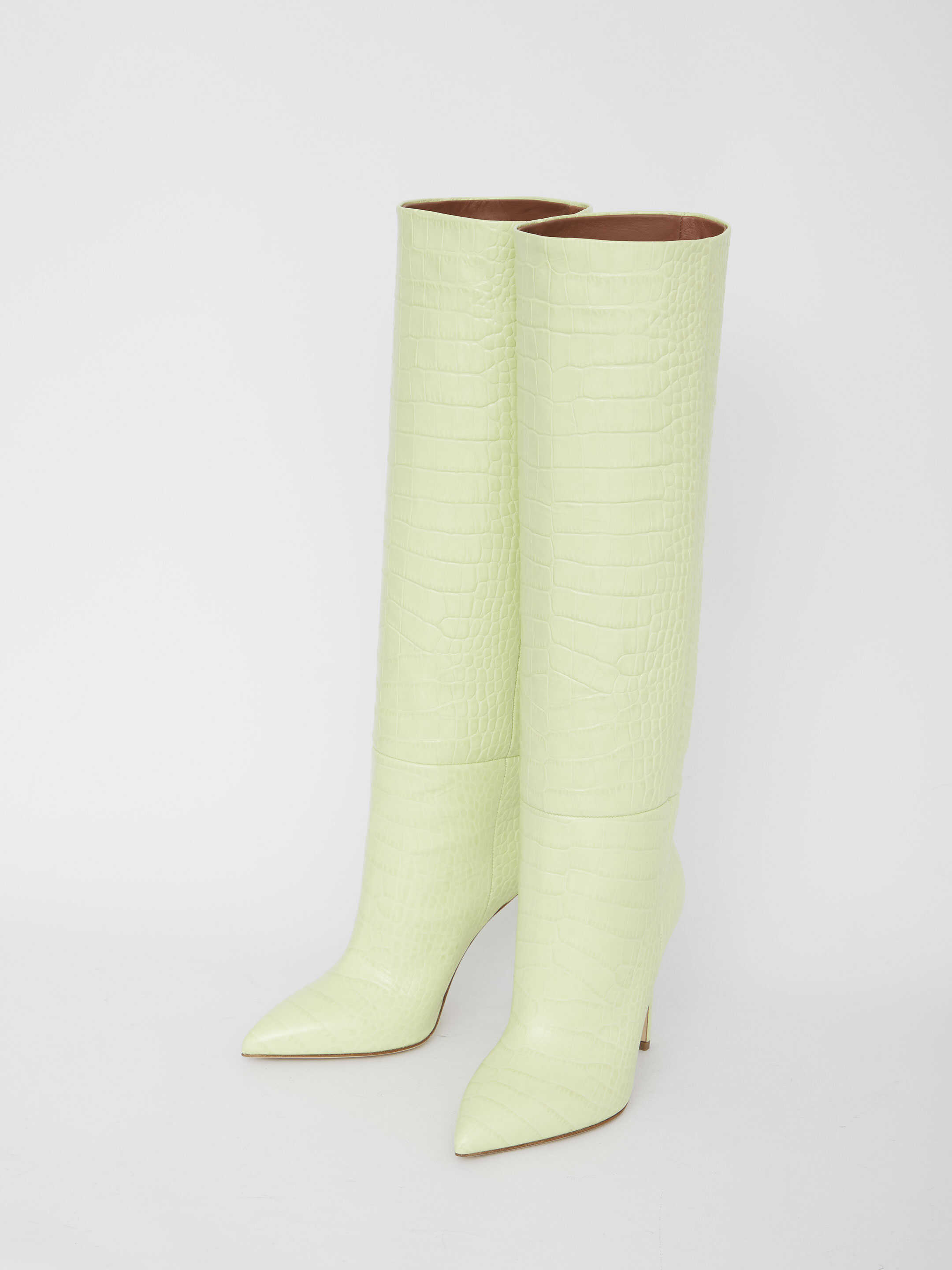 Knee-high boots in crocodile-embossed yellow leather. Pointed toe and stiletto heel. Leather sole.