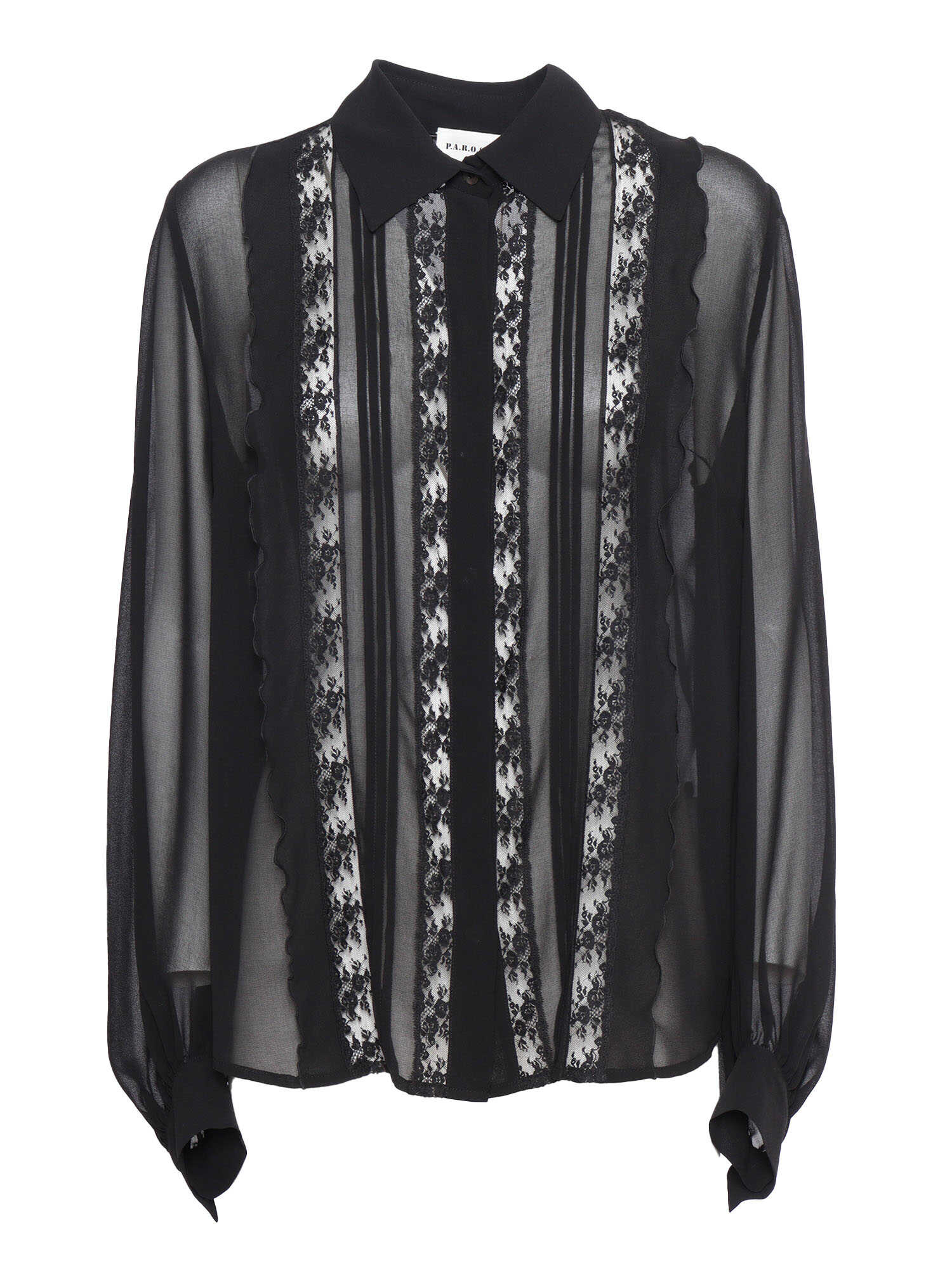 Transparent shirt, floral lace details, ruffle detail, hidden fastening