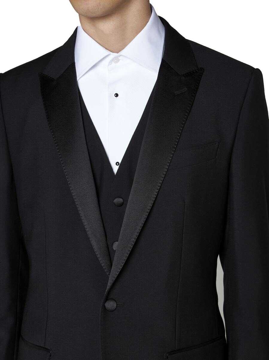 Black wool blend three-piece dinner suit from DOLCE & GABBANA featuring tailored cut, peak lapels, chest welt pocket, long sleeves, buttoned cuffs, front button fastening, front flap pockets, central rear vent, front button fastening, sleeveless, two front welt pockets, belt loops, concealed front fastening, two side slit pockets, two rear welt pockets and pressed crease.