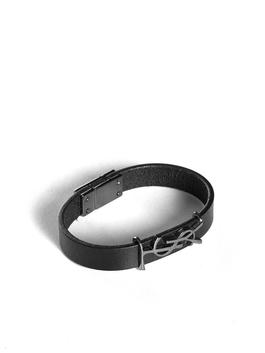 Opyum leather bracelet from SAINT LAURENT featuring black, silver-tone, calf leather, silver-tone logo lettering and clasp fastening.