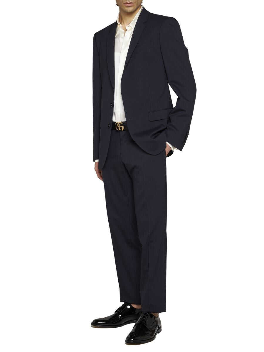 Blue cotton-blend single-breasted tailored suit from DOLCE & GABBANA featuring notched lapels, chest welt pocket, front button fastening, long sleeves, front flap pockets, central rear vent, belt loops, front button and zip fastening, two side slit pockets, two rear welt pockets and slim cut.