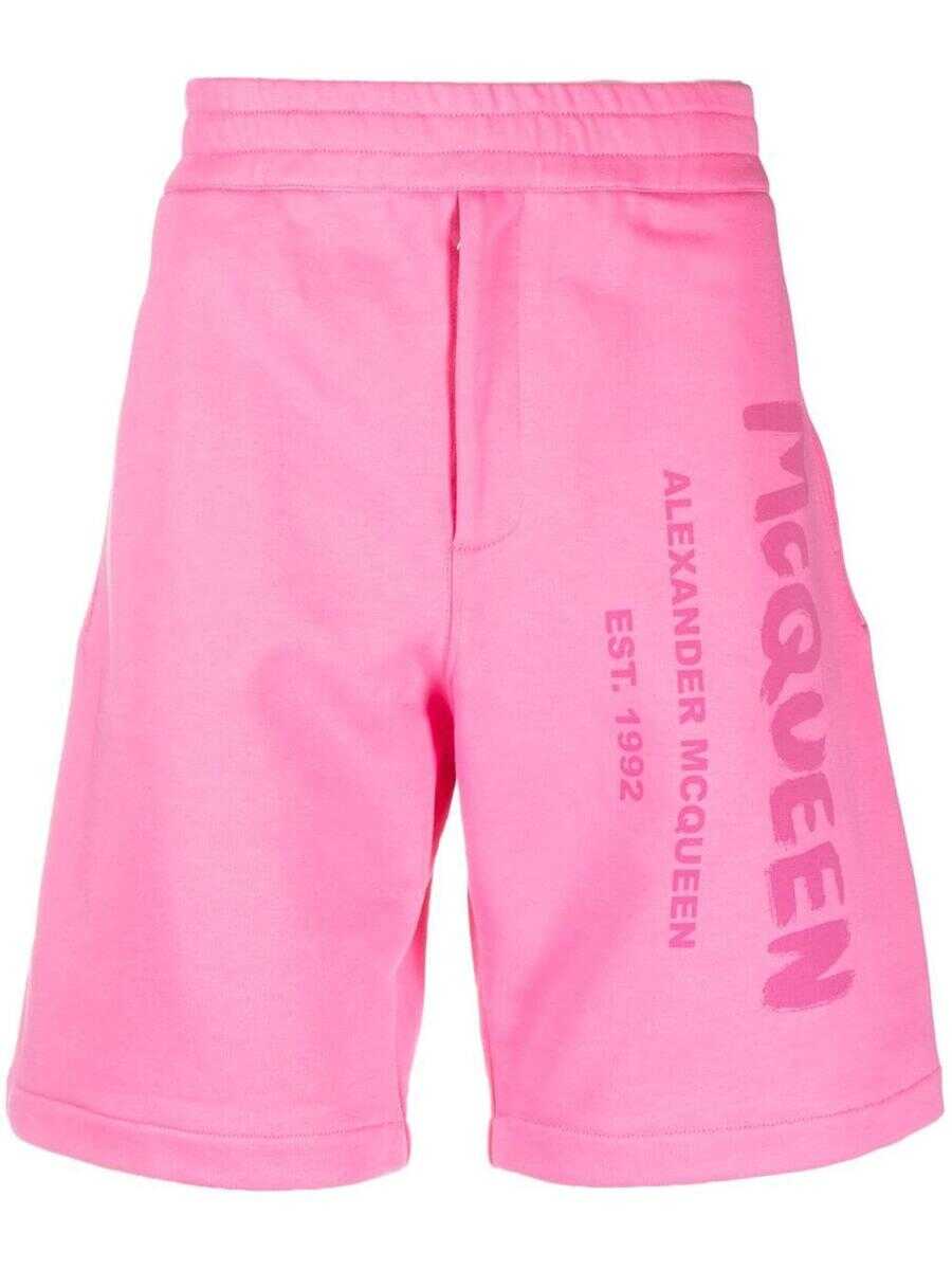 logo-print cotton track shorts from Alexander McQueen featuring pink, cotton, jersey fleece, logo print at the leg, elasticated waistband, rear welt pocket and straight leg.