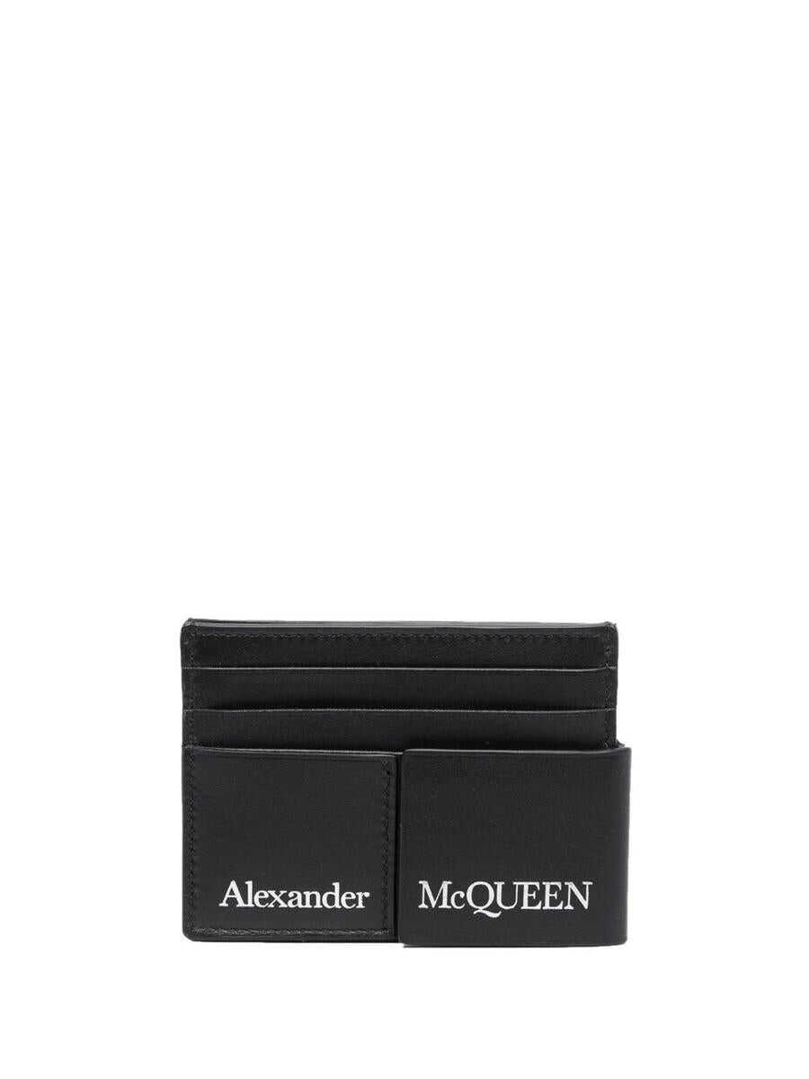 logo-print layered cardholder from Alexander McQueen featuring black, calf leather, layered details, logo print to the front, internal logo stamp, card slots and internal card slot.