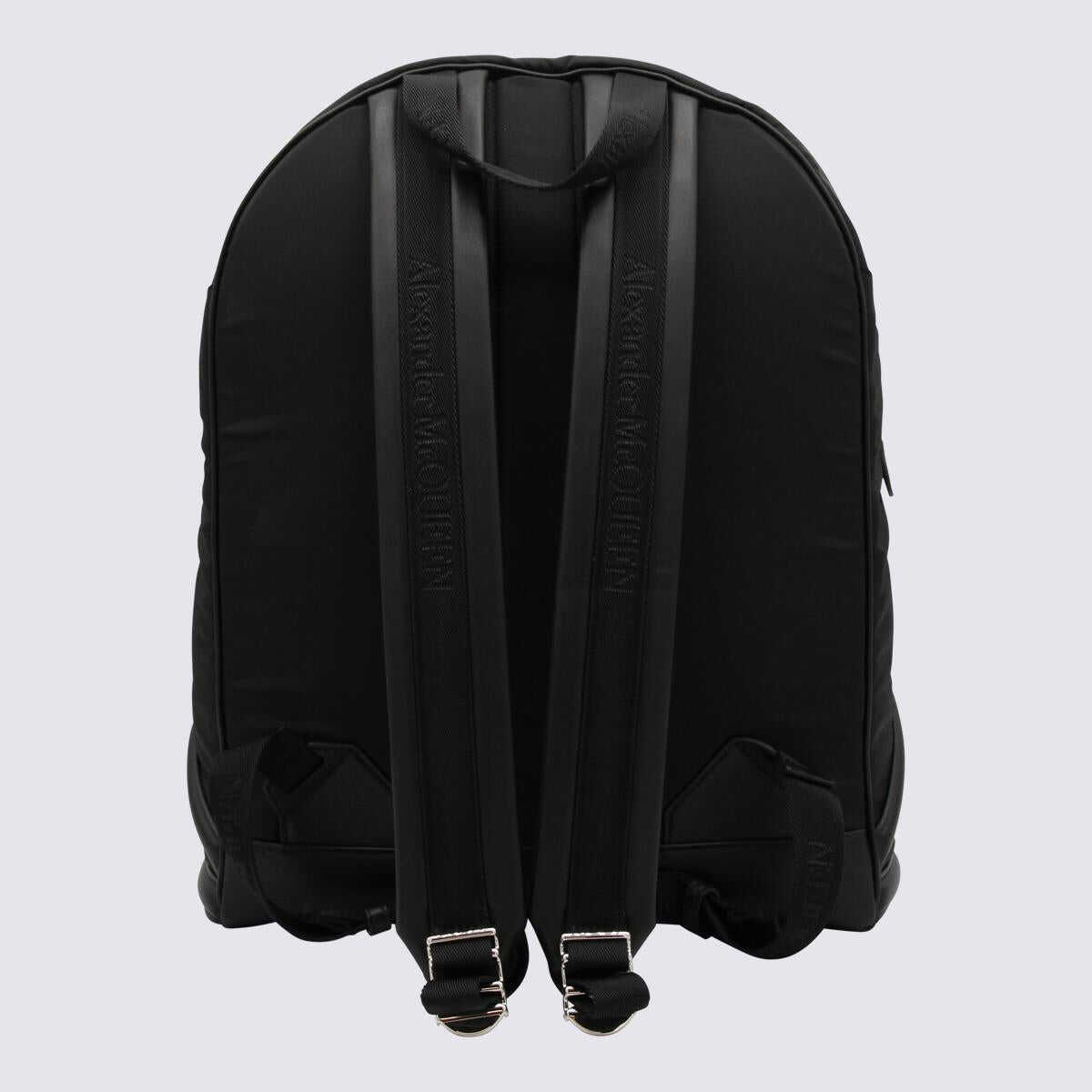 Black nylon Harness backpack from Alexander McQueen featuring canvas handle, embossed logo at front, zip closure and crossing motif at front.