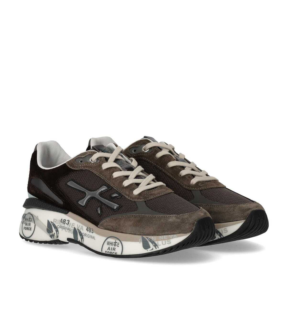 Moerun 6446 sneaker by Premiata made of mesh and suede in shades of brown and beige. Inserts in grey reflective fabric, logo on the side and heel and beige cotton laces. Leather lining and insole, rubber sole with typical brand prints. Height 5.5 cm.