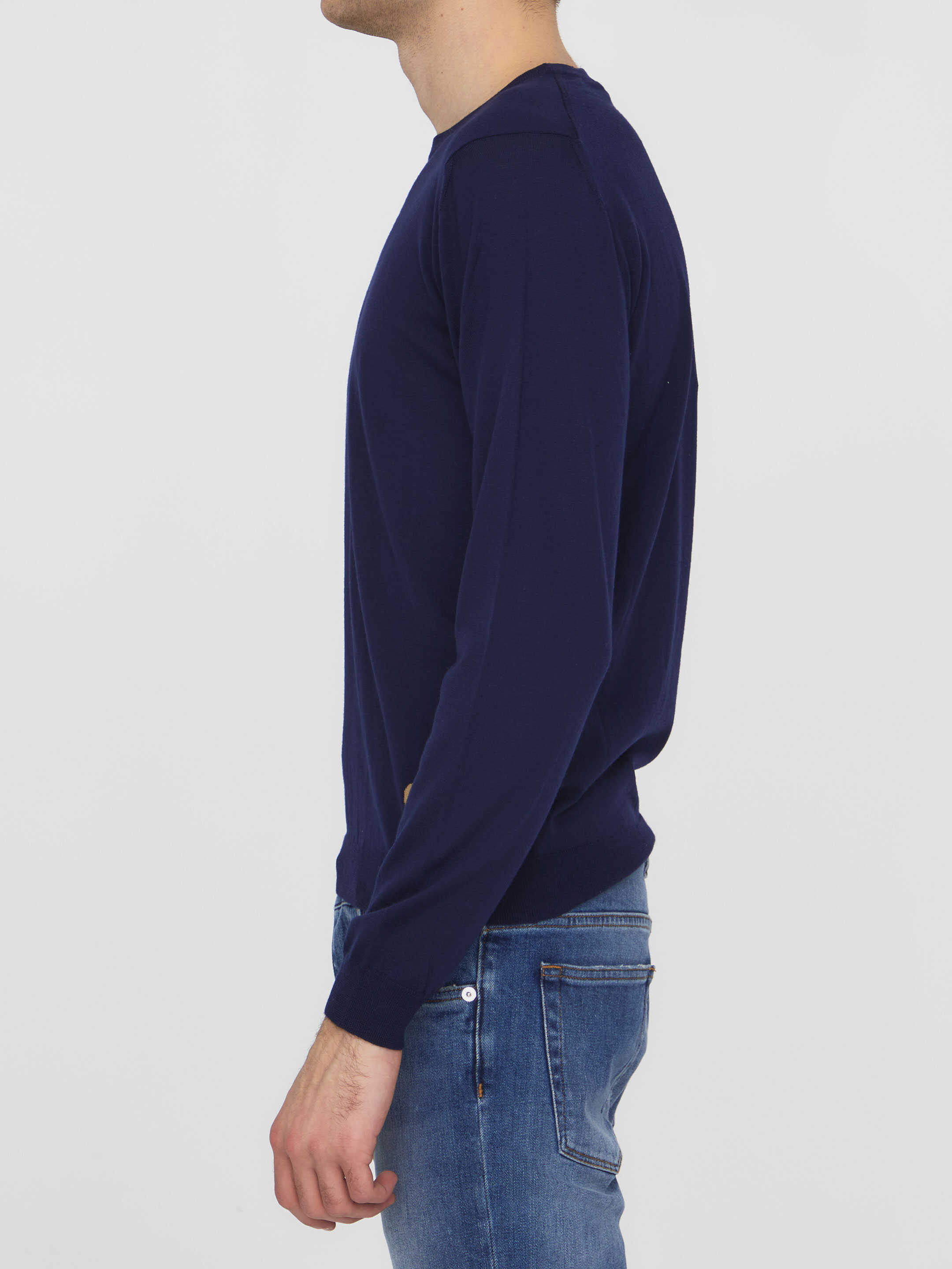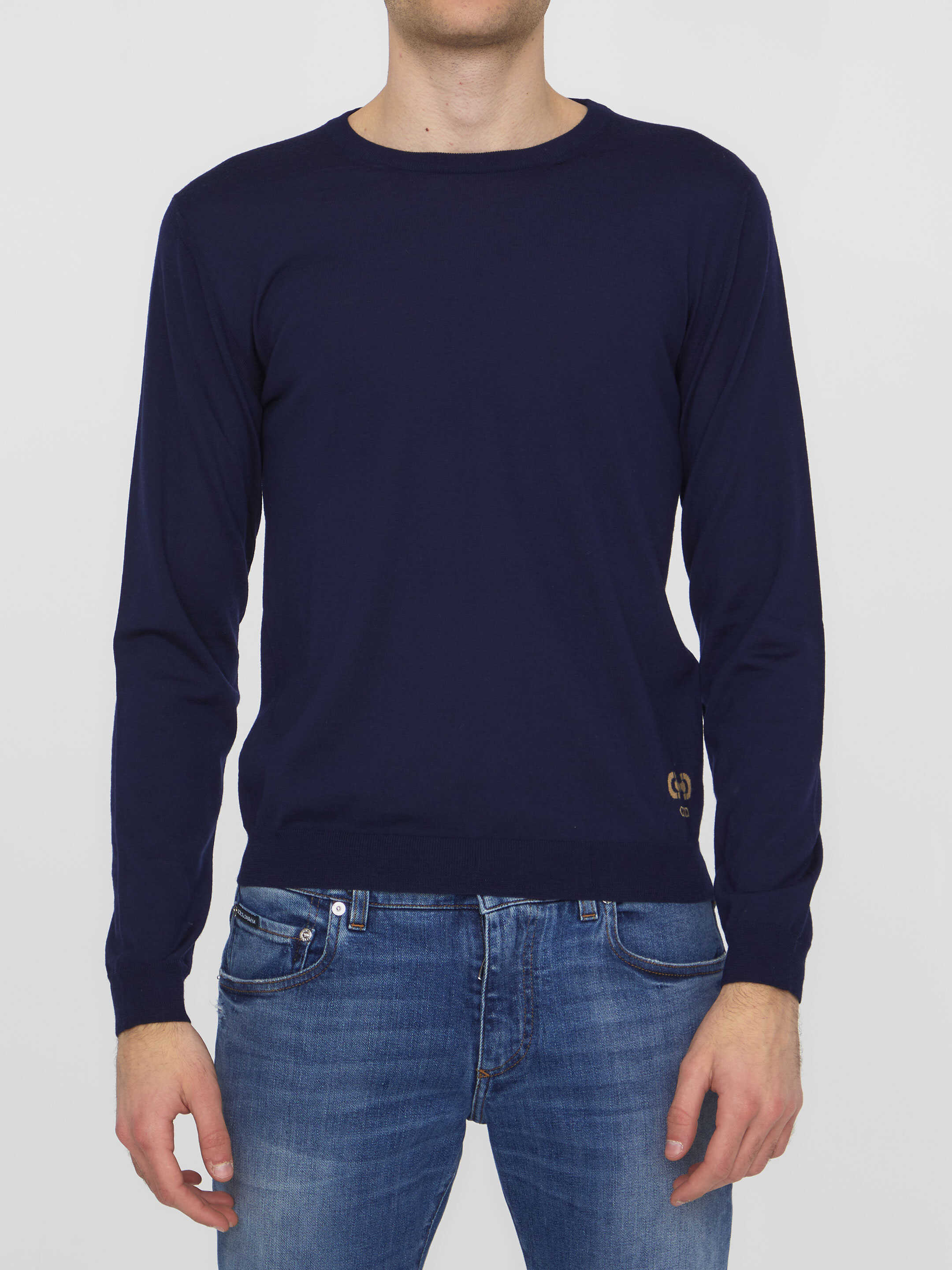 Long-sleeved crewneck jumper in blue wool featuring Horsebit embroidery with Gucci logo on hem. Ribbed neck, cuffs and hem.