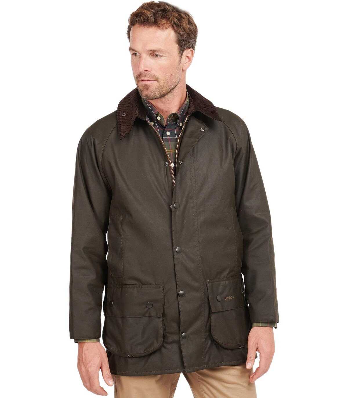 Classic Beaufort Wax jacket by Barbour made of olive green waxed cotton. Cotton lined interior with iconic tartan pattern in shades of green and brown, brown velvet ribbed collar with buttons to attach any hood to. Multiple pockets on the front, zip and snap buttons closure.