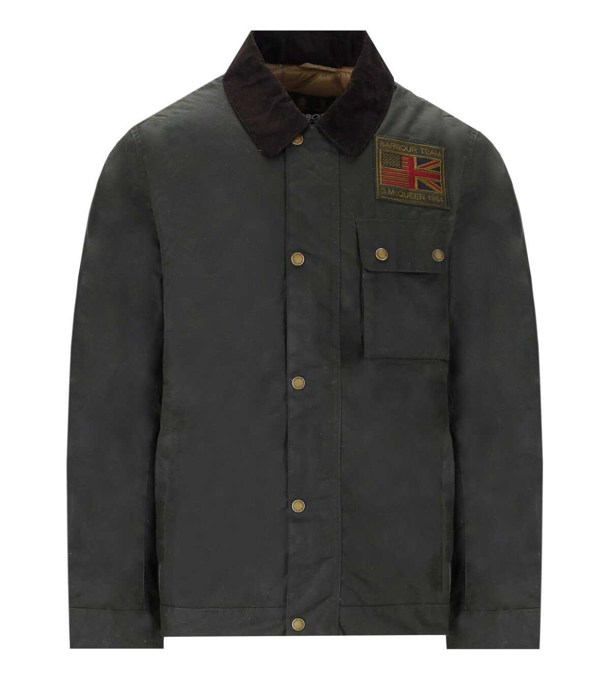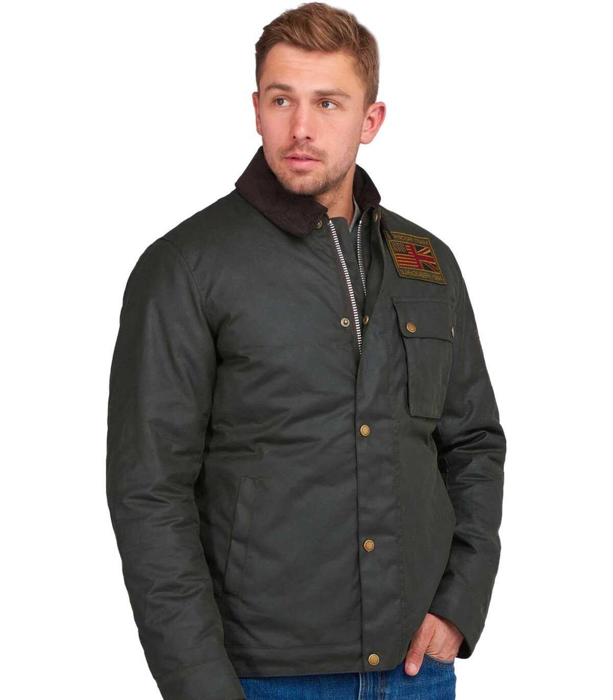 Workers Wax jacket by Barbour Intl made of sage green waxed cotton, featuring a brown velvet ribbed collar and interior with nylon lining, padded. Welt pocket on the inside, multiple pockets on the outside. Patch on the left chest and embroidered logo with Steve McQueen's autograph on the left sleeve. Adjustable cuffs, zip closure and flap with buttons.
