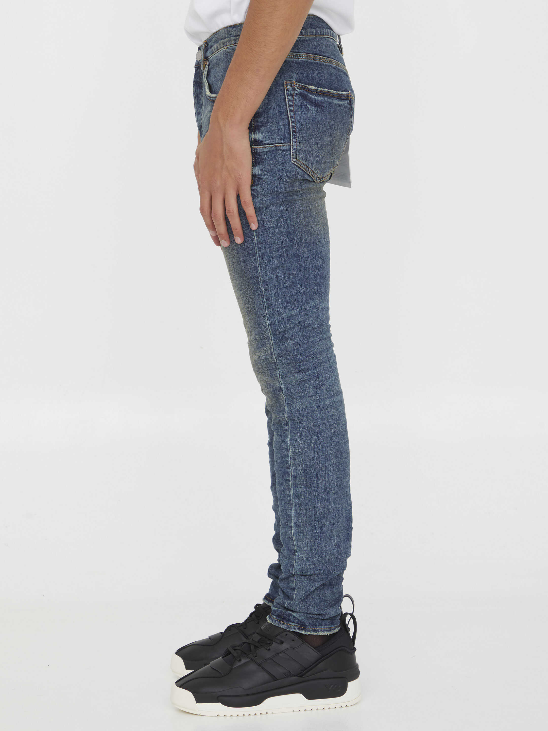 Slim jeans in blue denim with vintage and crinkled effect. It features button closure, five-pocket design, belt loops and Purple Brand patch at the back. Slim fit.