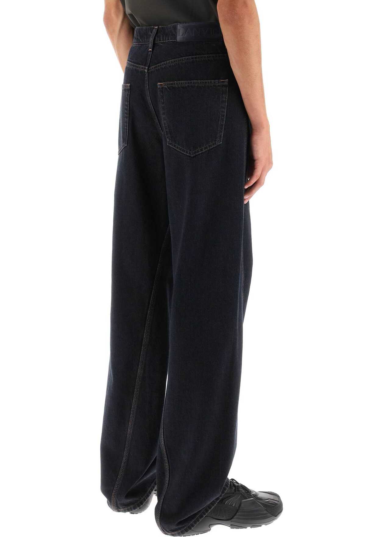Lanvin jeans crafted in pure cotton denim with dark wash and side twisted seams. Five-pocket design featuring front closure with button fly, belt loops and logoed jacron on the back of the waist. Baggy fit. The model is 187 cm tall and wears size 30.