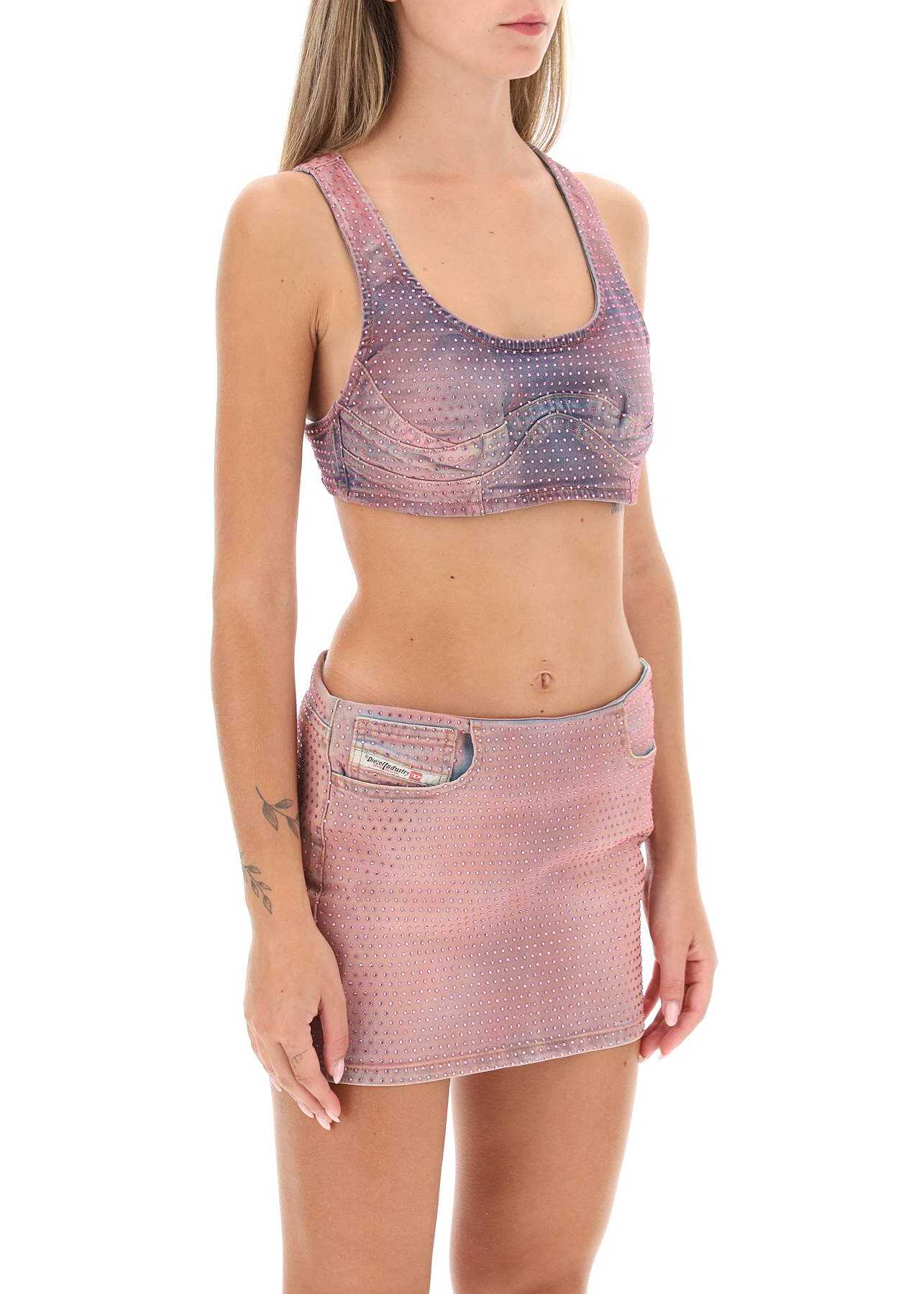 Diesel cropped top crafted in dyed stretch-cotton denim embellished with rhinestones all-over. It features racerback neckline and side zipper closure. Fitted. The model is 177 cm tall and wears size S.