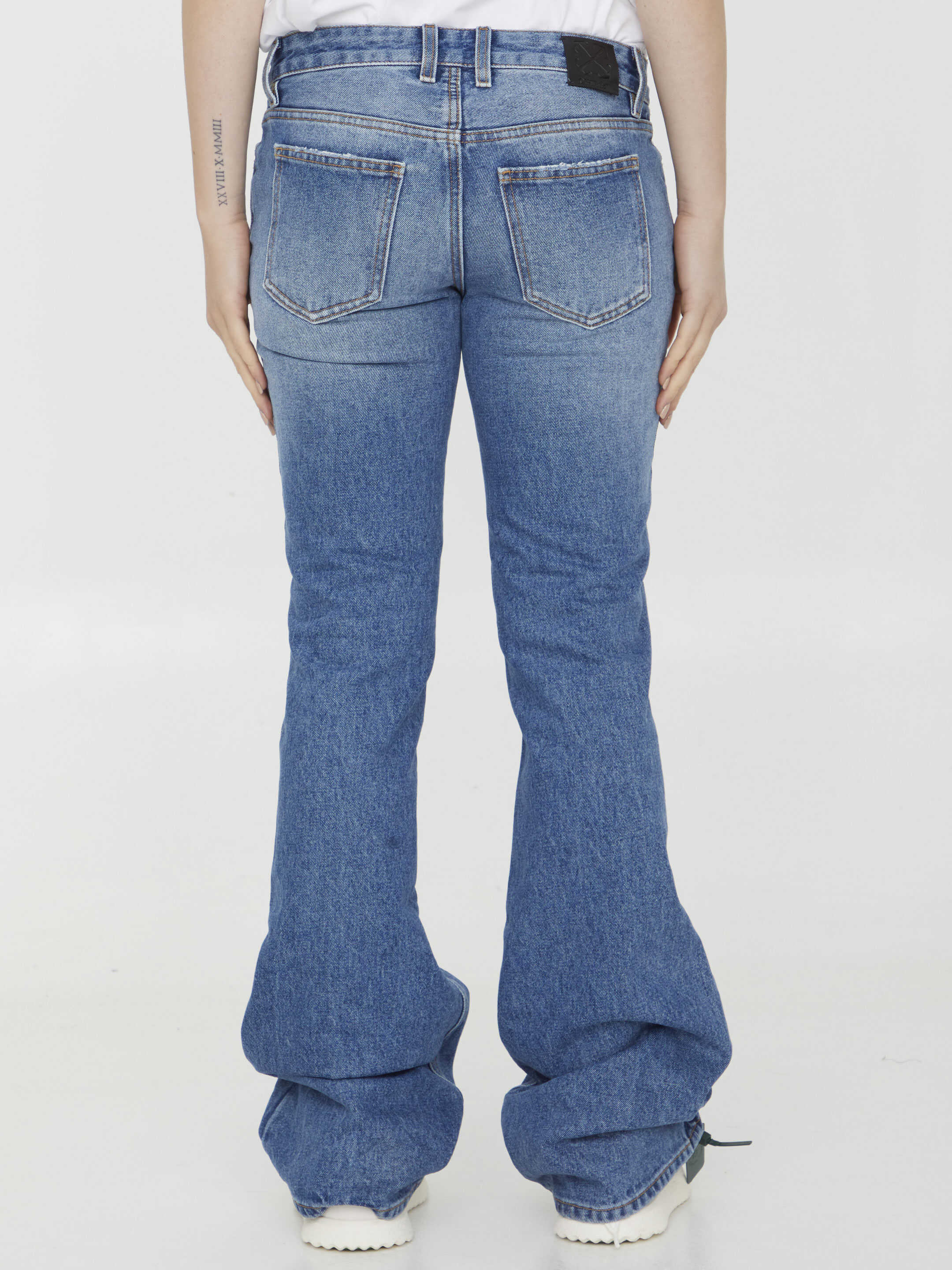 Low-rise jeans in washed blue denim with wide leg. It features zip and button closure, five-pocket design and belt loops. Off-White leather patch at the back. Slim fit.