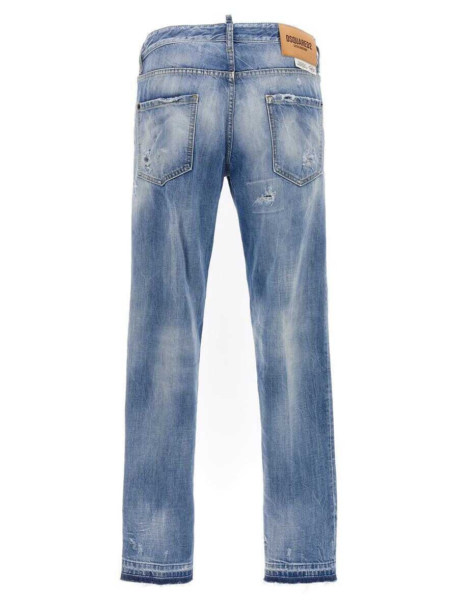 Light blue cotton jeans from Dsquared2 featuring washed denim, distressed effect, ripped detailing, mini logo tag, logo patch to the rear, straight leg, concealed fly and button fastening, classic five pockets, belt loops and contrasting trim.