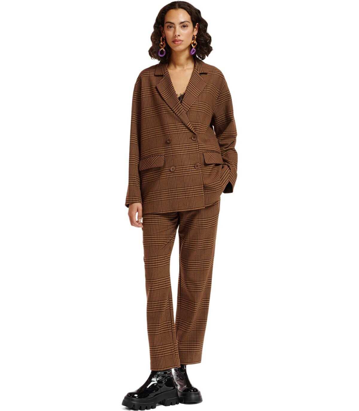 Eosha pants by Essentiel Antwerp made of viscose blend fabric with Prince of Wales pattern in shades of brown. Elasticated waist with drawstring, welt pockets on the sides and back. Medium waist, tapered leg.