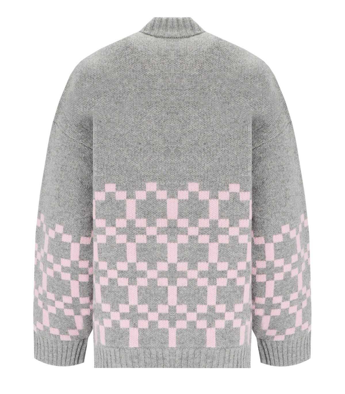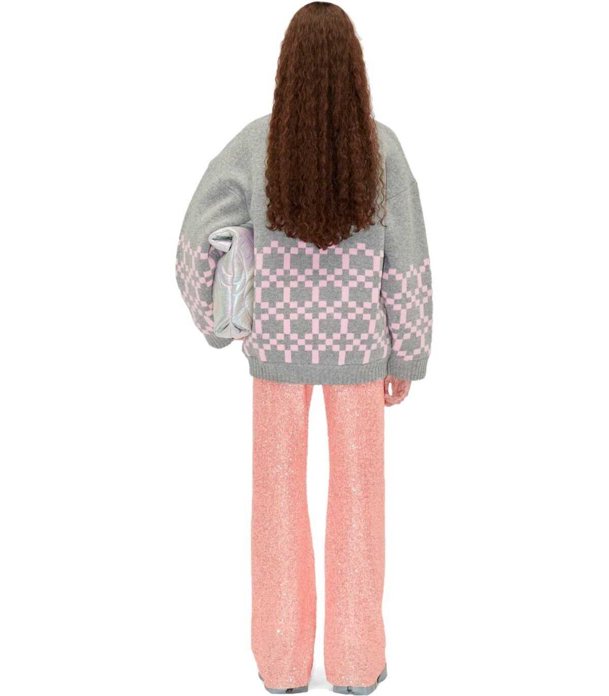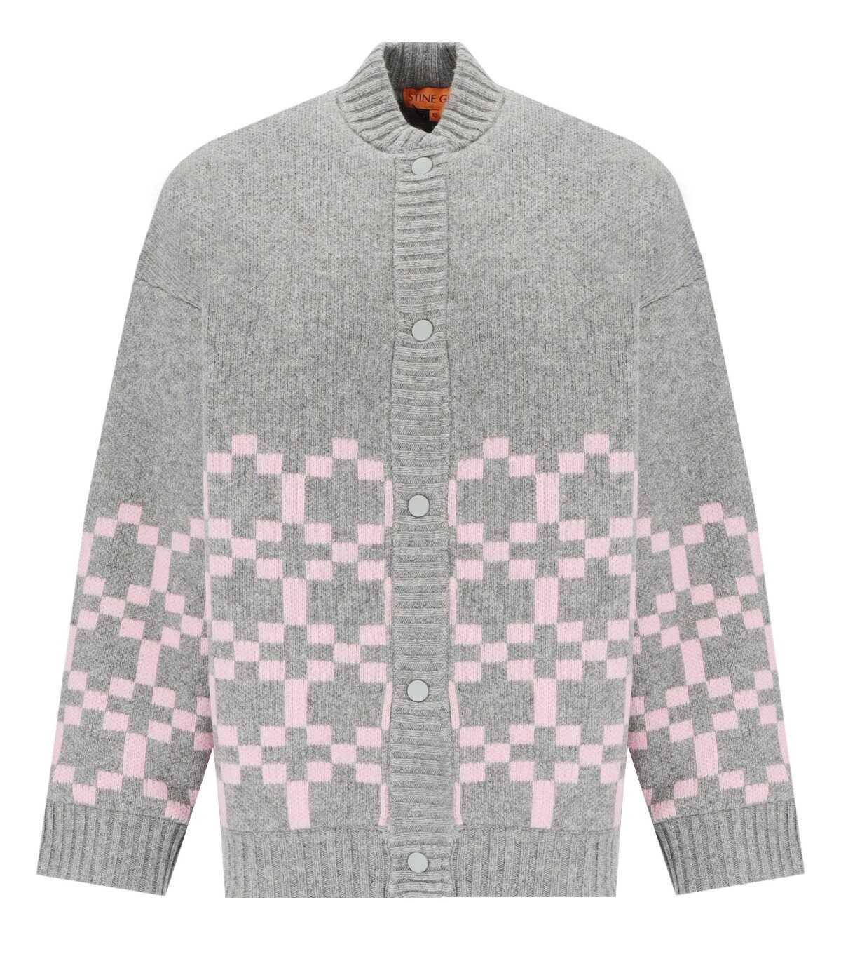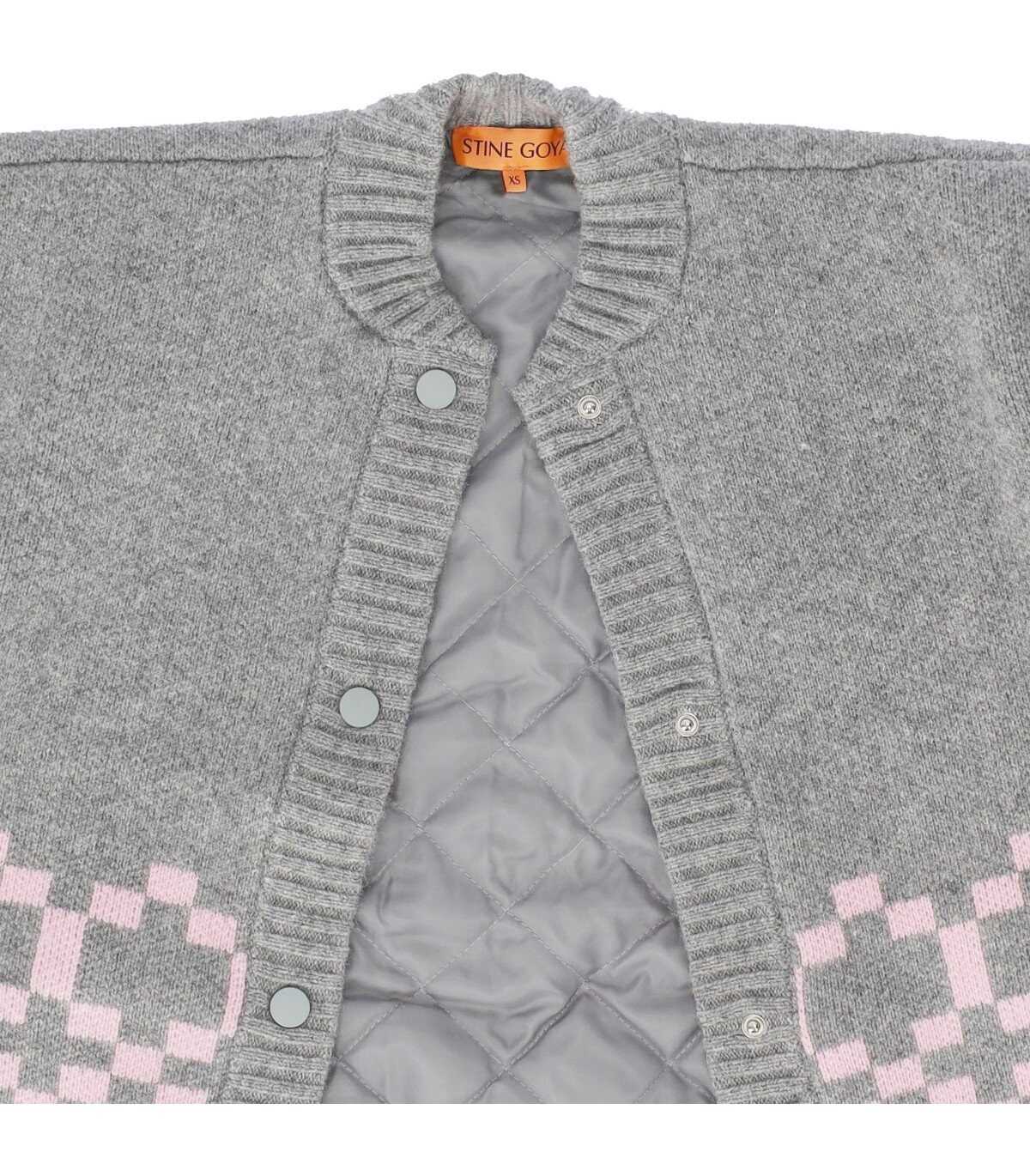 Tino bomber jacket by Stine Goya made of wool blend in shades of grey, decorated with a pink geometric pattern. Ribbed collar, cuffs and hem, lined interior with diamond quilting. Snap button closure, oversized fit.