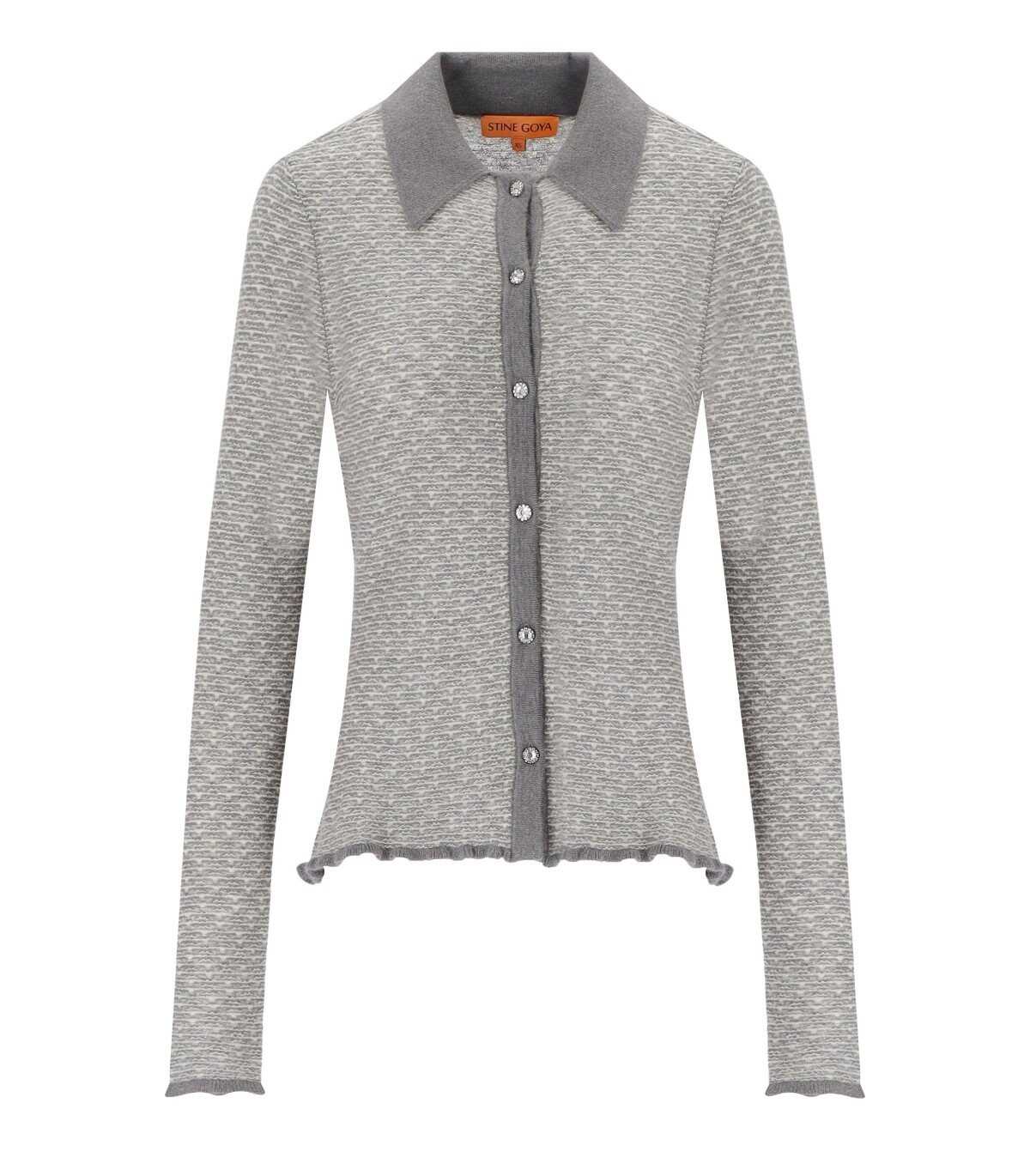 Bobbi cardigan by Stine Goya made of grey wool and alpaca blend, featuring a polo collar, ruched finishing on cuffs and hem and closure with jewel buttons. Close fit.