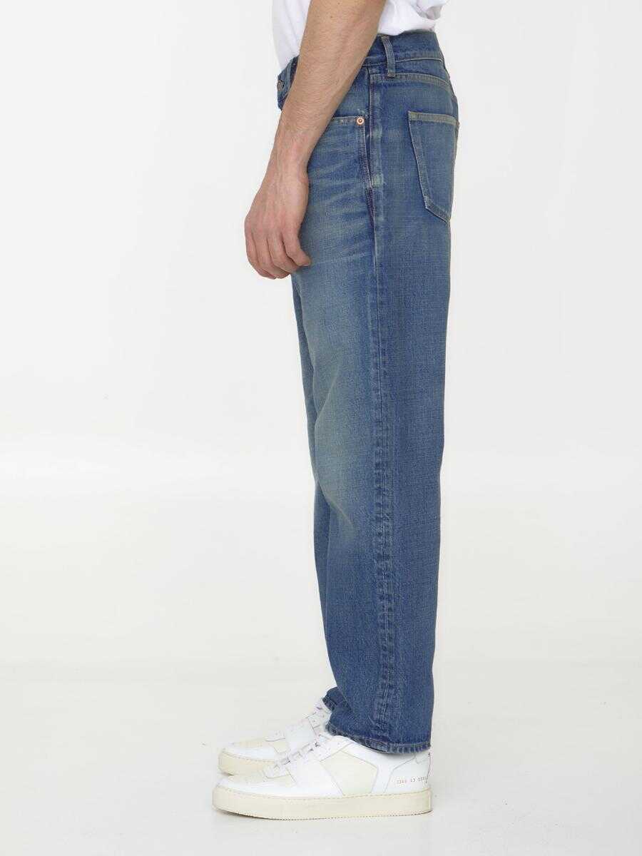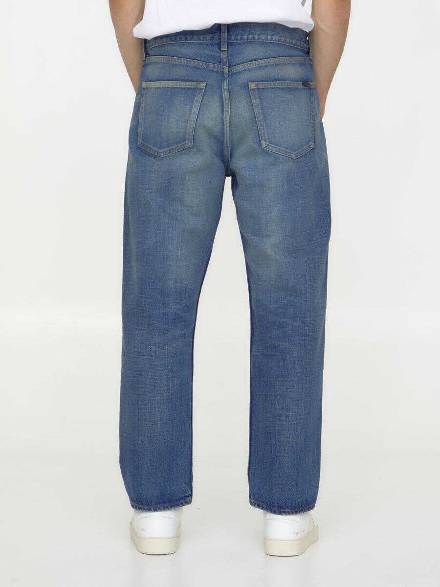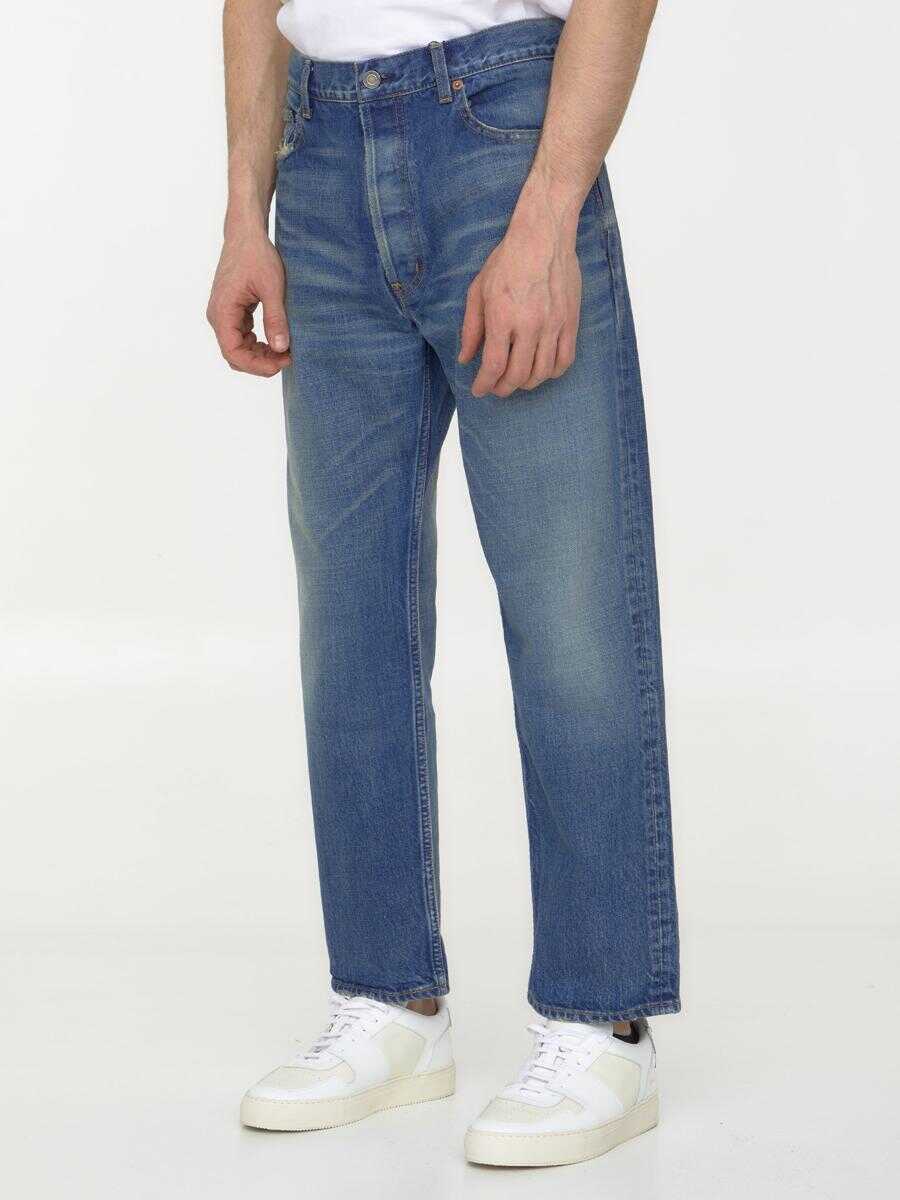 Blue denim straight-leg jeans with washed-out effect. It features button closure, five-pocket design and belt loops.