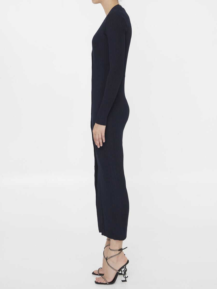 Long cardigan dress in blue ribbed viscose knit. It features deep V-neckline, front button closure and front slit. Semi-sheer design. Fitted cut.