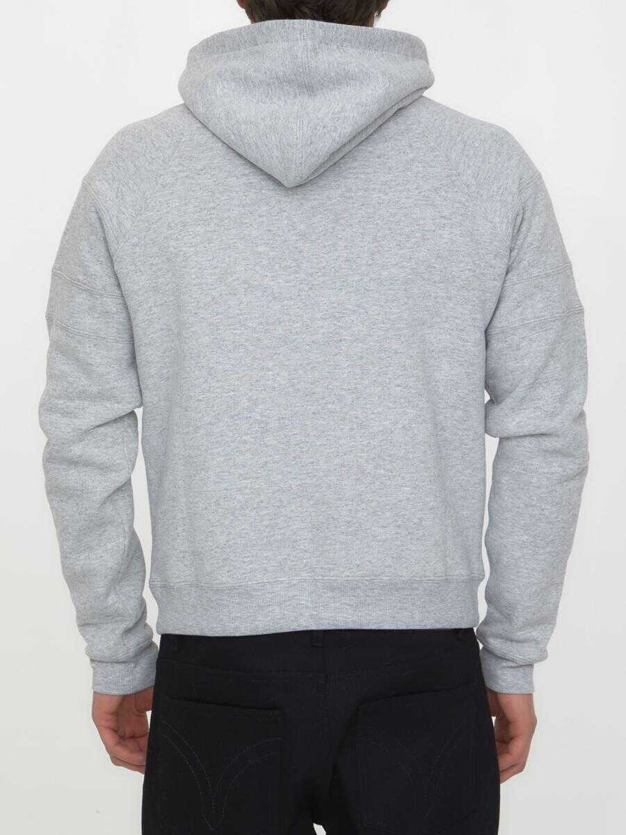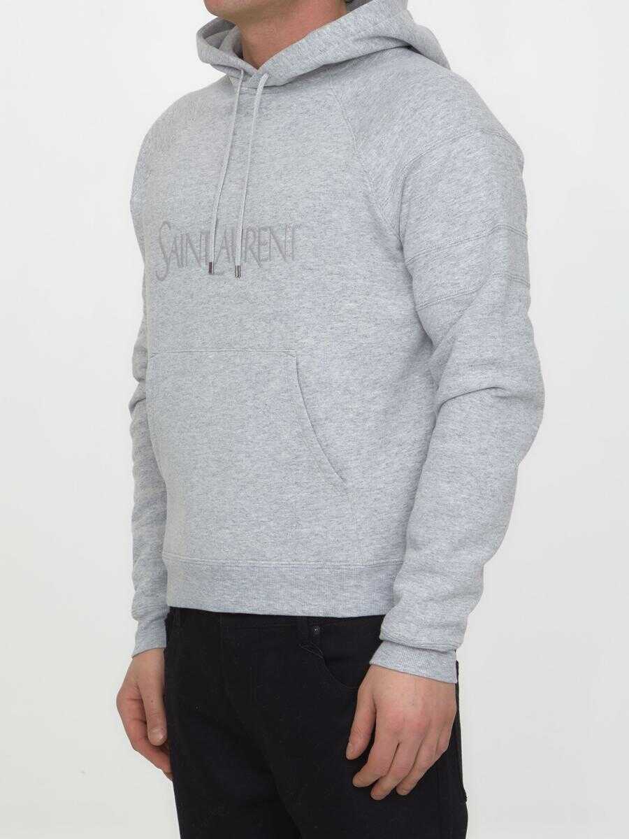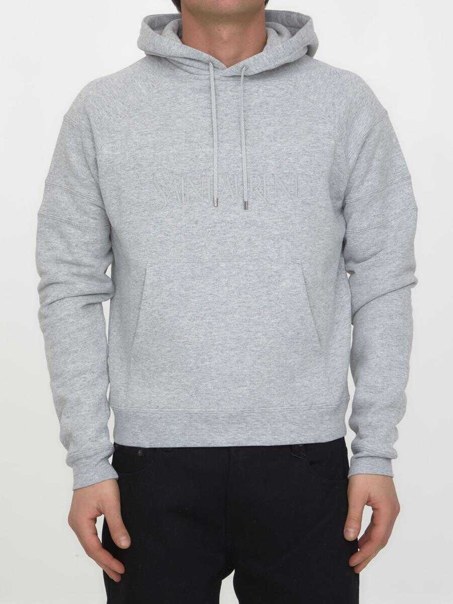 Grey brushed cotton hoodie with tone-on-tone Saint Laurent logo embroidered on chest. It features drawstring hood, one front kangaroo pocket and ribbed trims on cuffs and hem.