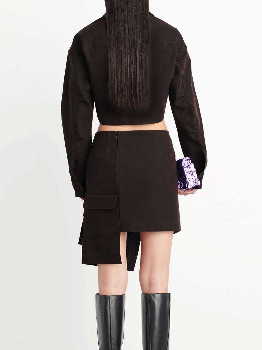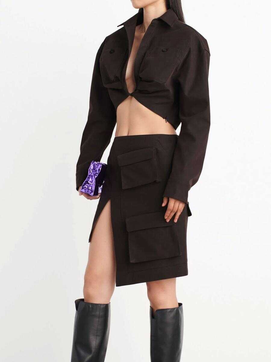 Cargo cropped shirt in dark grey cotton blend with gathered detailing. It features classic collar, two front buttoned patch pockets and buttoned cuffs.