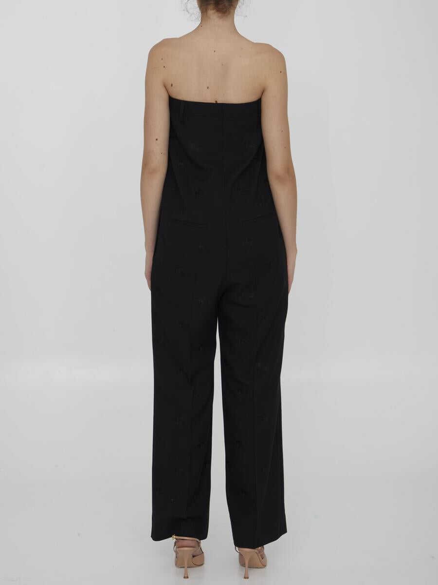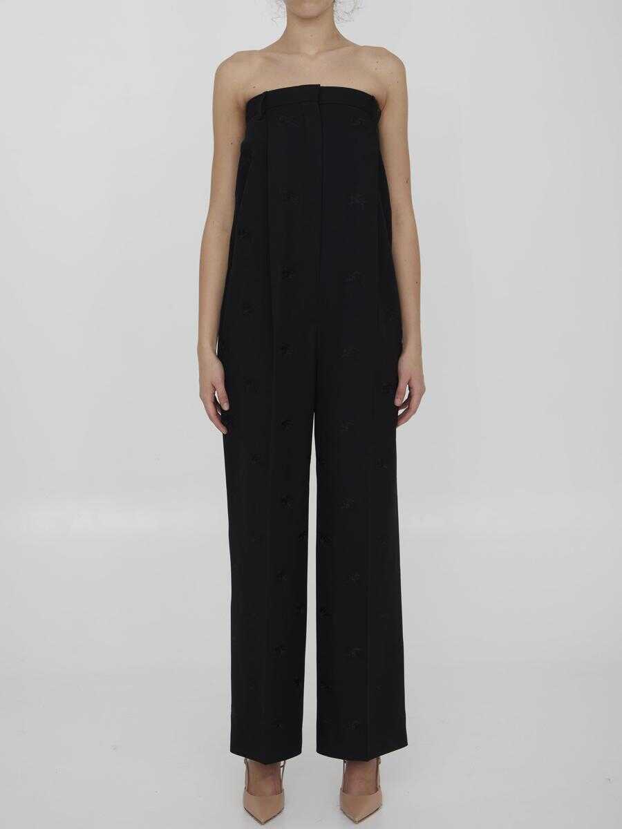 Strapless tailored jumpsuit in black wool with all-over tone-on-tone embroidered Equestrian Knight pattern. It features pleated design, front zip closure, two side welt pockets and two rear welt pockets.