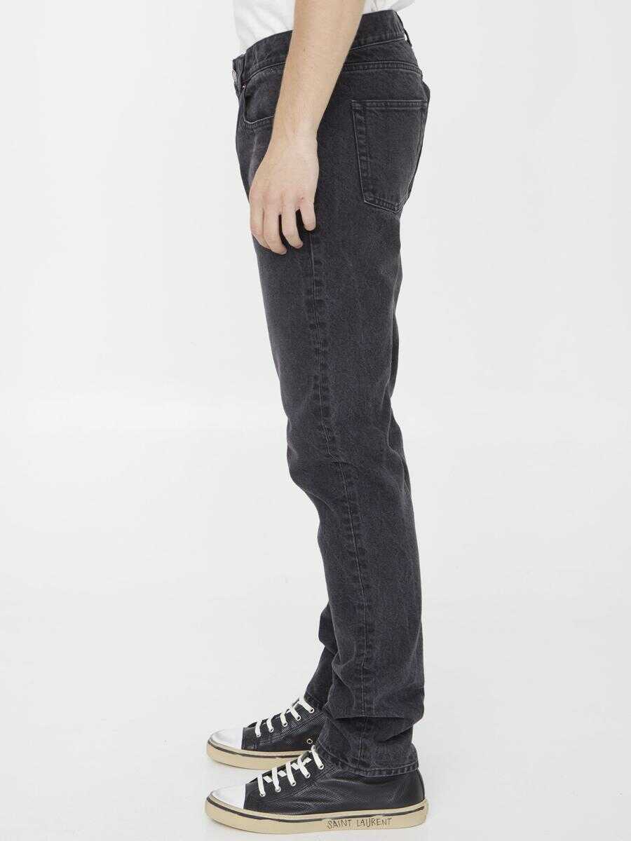Black denim jeans. It features button closure, five-pocket design and belt loops. Slim fit.