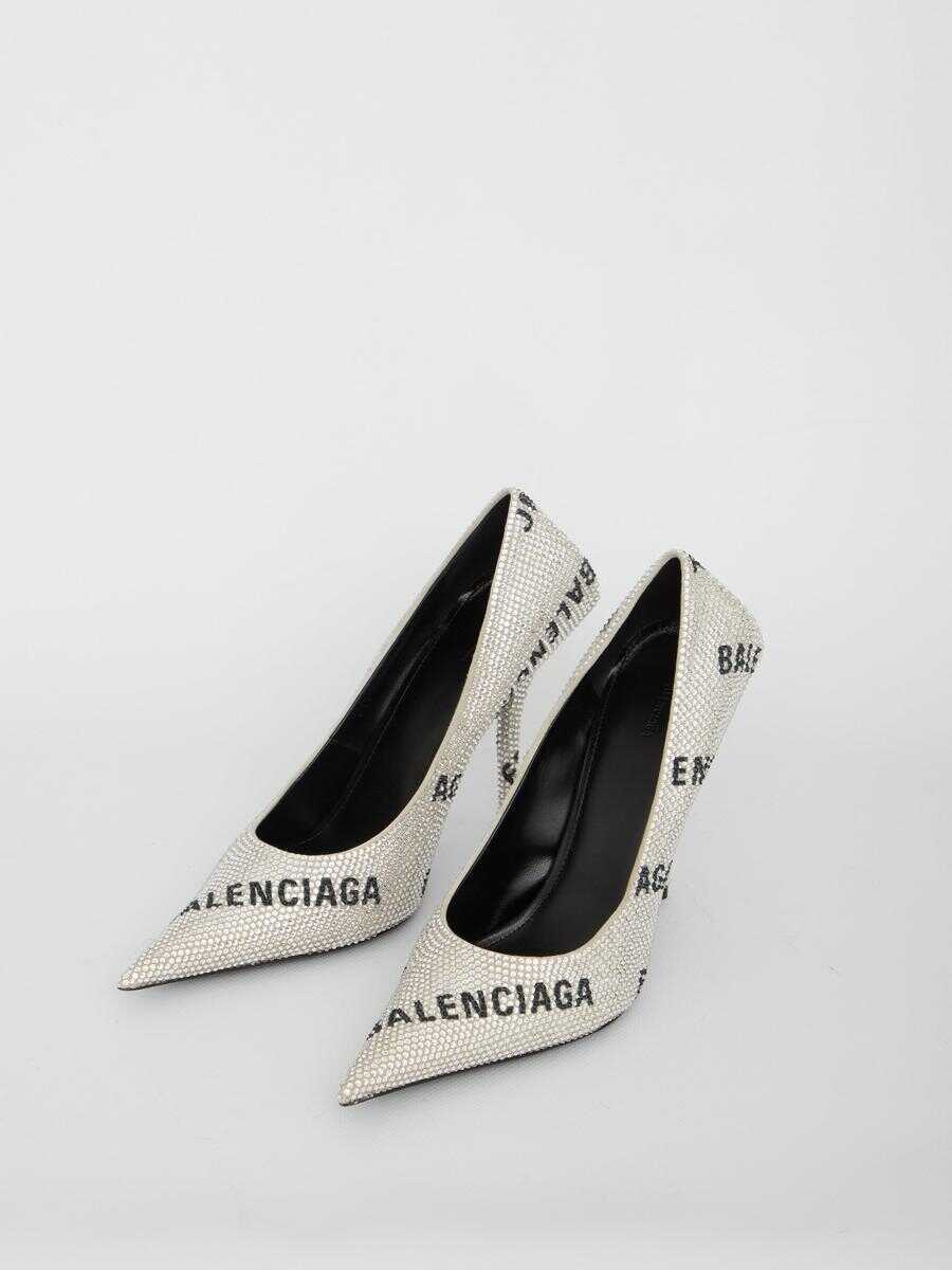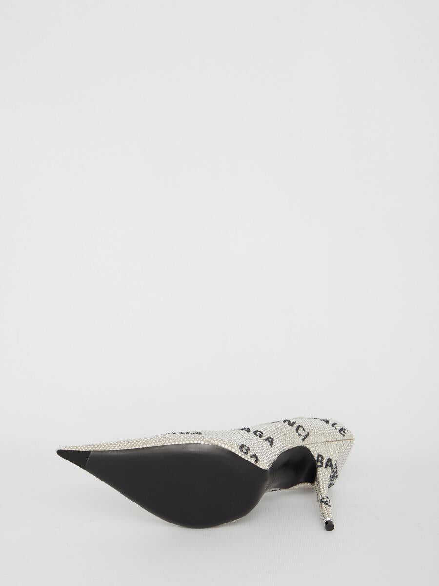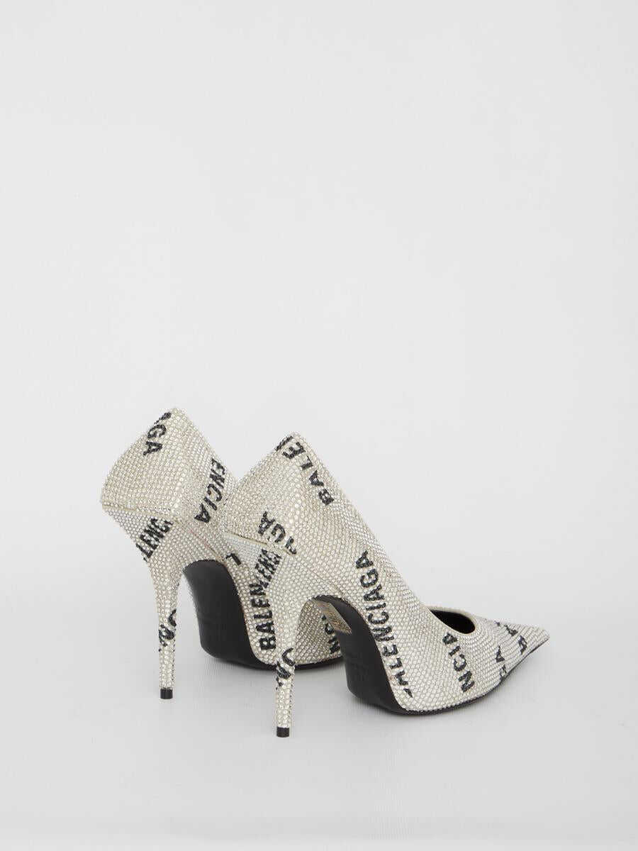 Square Knife pumps in light grey and black suede calfskin with Allover Logo rhinestones. Pointed design and killer heel. Square reinforcement at the back. Worn-out leather sole.