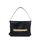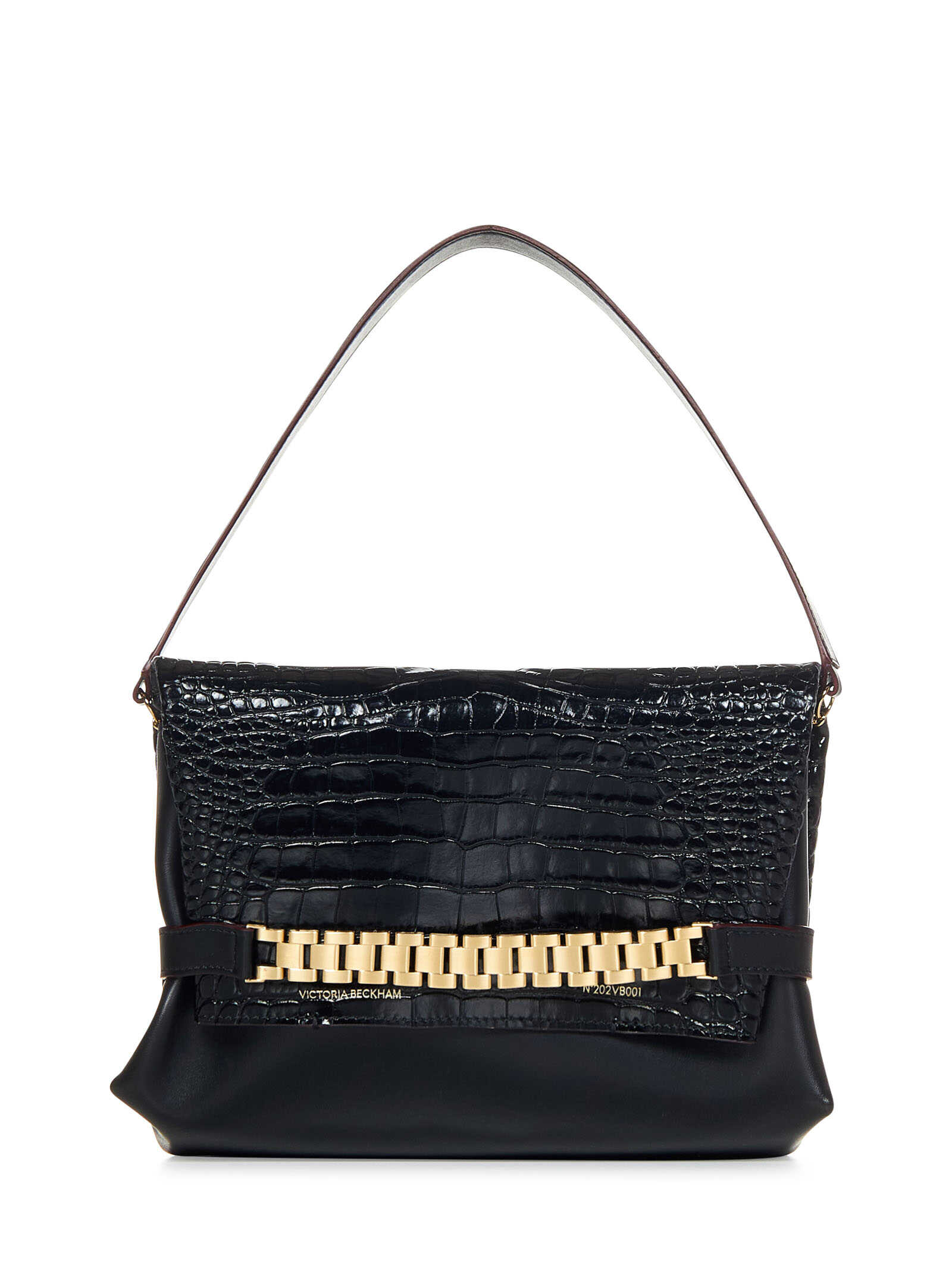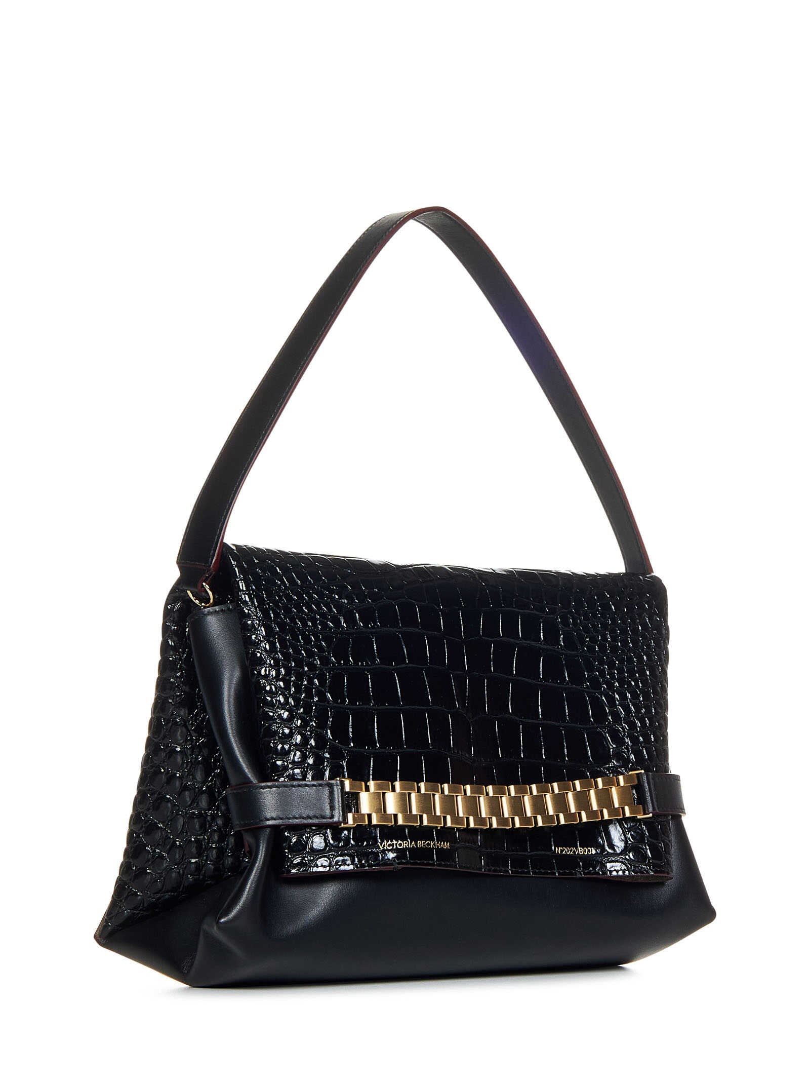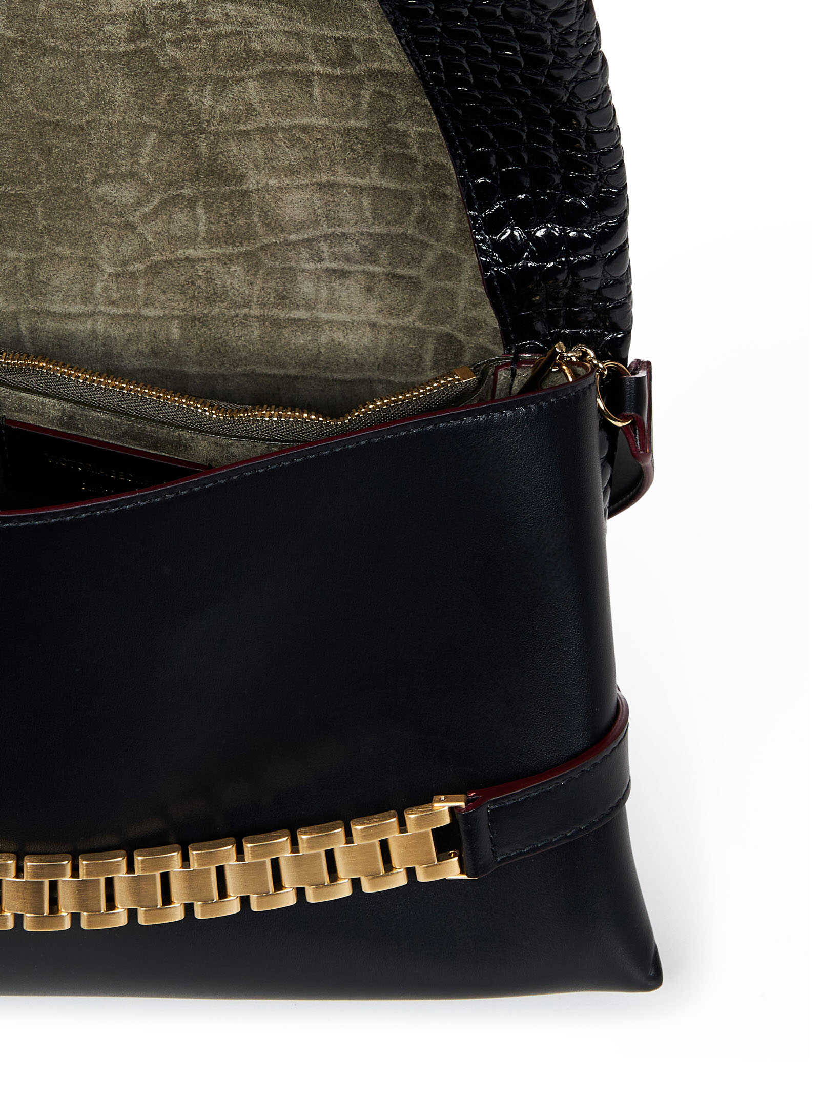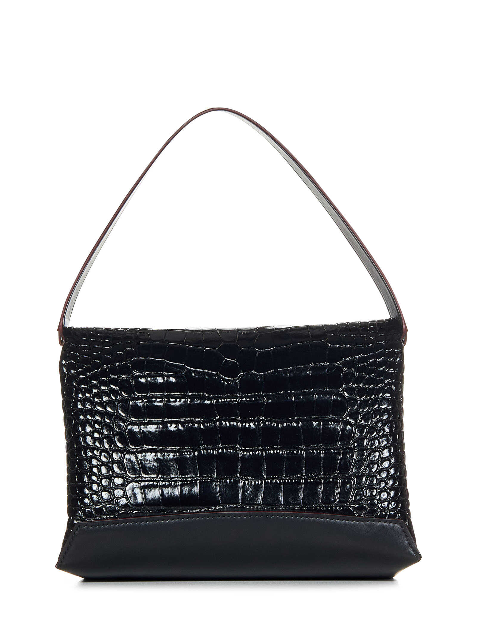 Black crocodile embossed leather and smooth leather pouch with watch strap and handle.