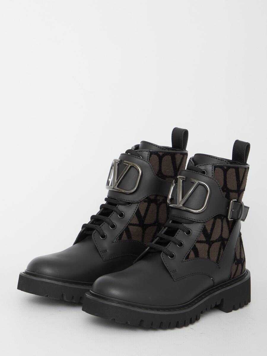 Valentino Garavani Combat boots in black calfskin with Toile Iconographe fabric insert and VLogo Signature embellishment. Side buckle detail and front lacing. Lug rubber sole.