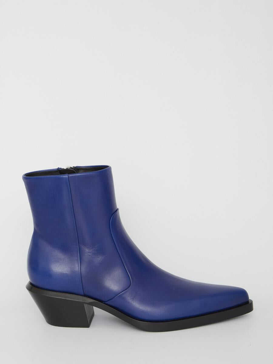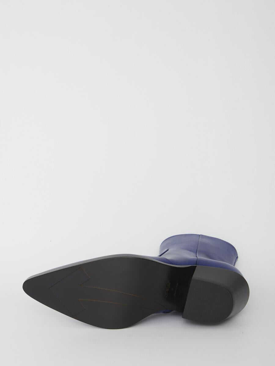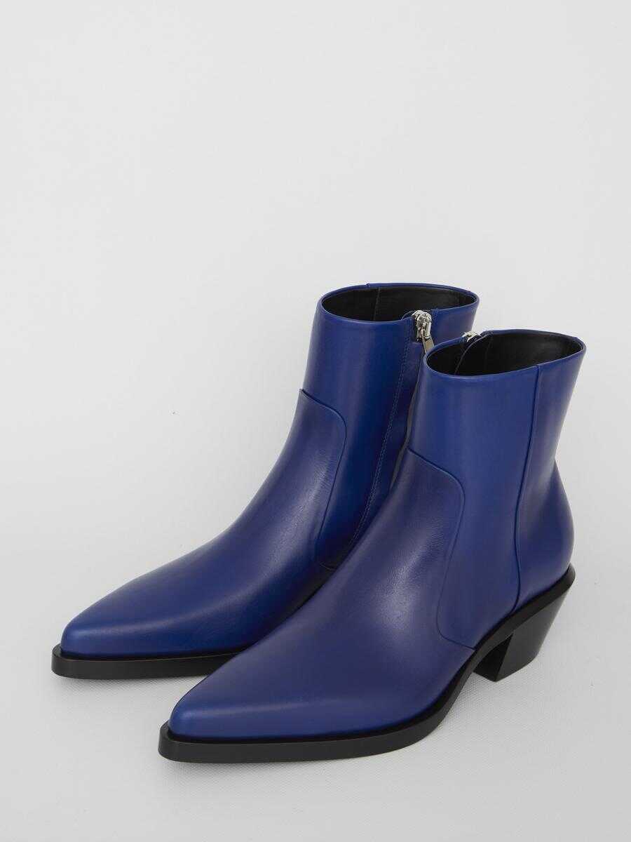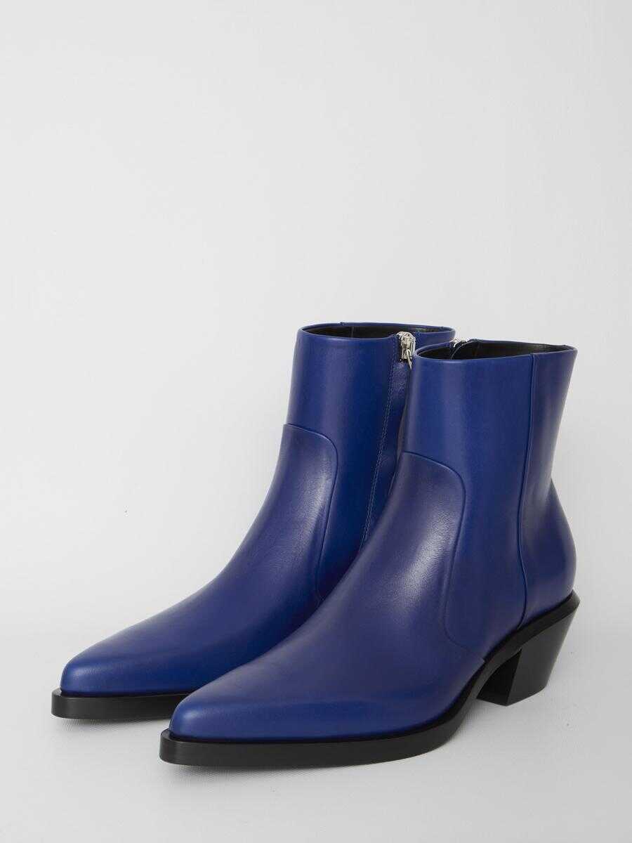 Slim Texan ankle boots in bluette leather. They feature pointed toe, side zip closure, square heel and black leather sole.