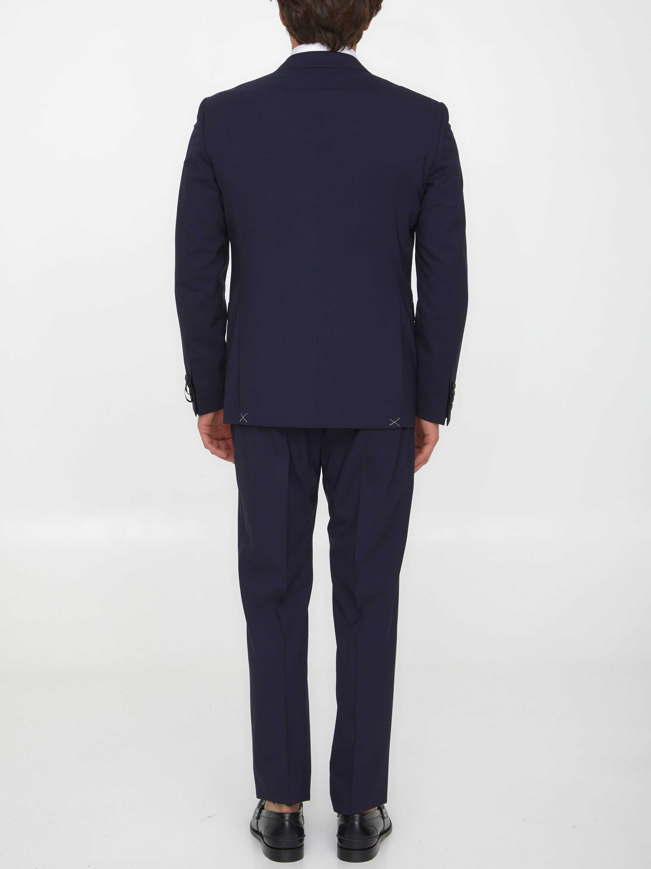 Blue virgin wool two-piece suit. Single-breasted jacket with peaked lapels, front two-button closure, two front flap pockets, a welt pocket on chest and buttoned cuffs. Straight-leg trousers with zip and hook-and-eye closure, two side welt pockets and two rear welt pockets.