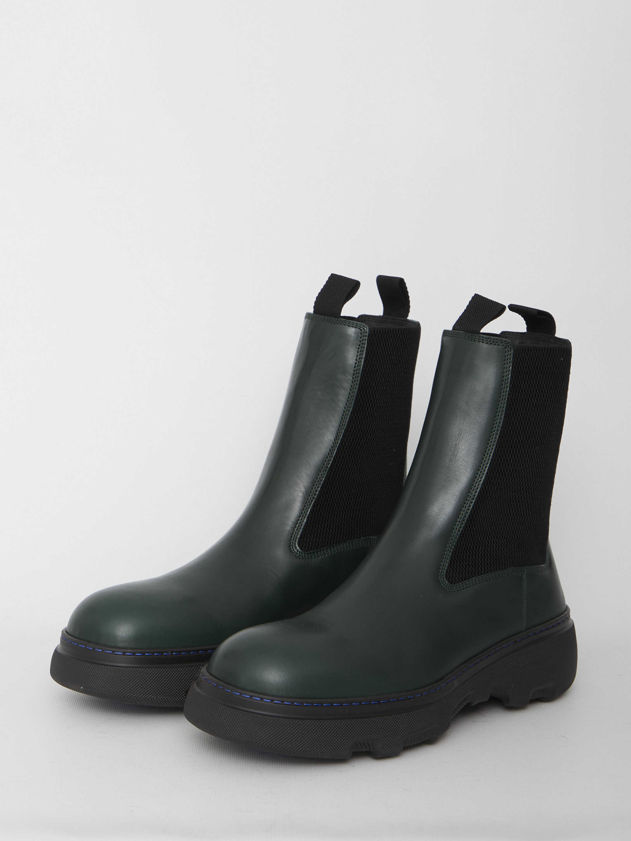 Creeper Chelsea boots in green calfskin with side elasticated inserts and rubber sole with Burberry lettering.