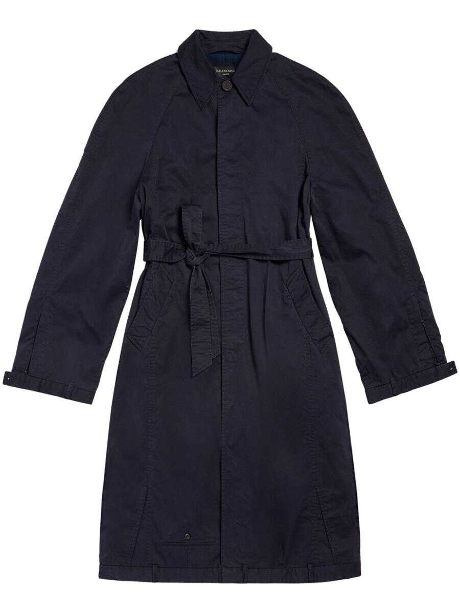 Blue night, cotton, Twill fabric, destructured design, classic collar, hidden front buttons closure, long sleeves raglan, edges with button, model with belt, two oblique side pockets, central rear slit and length under the knees.