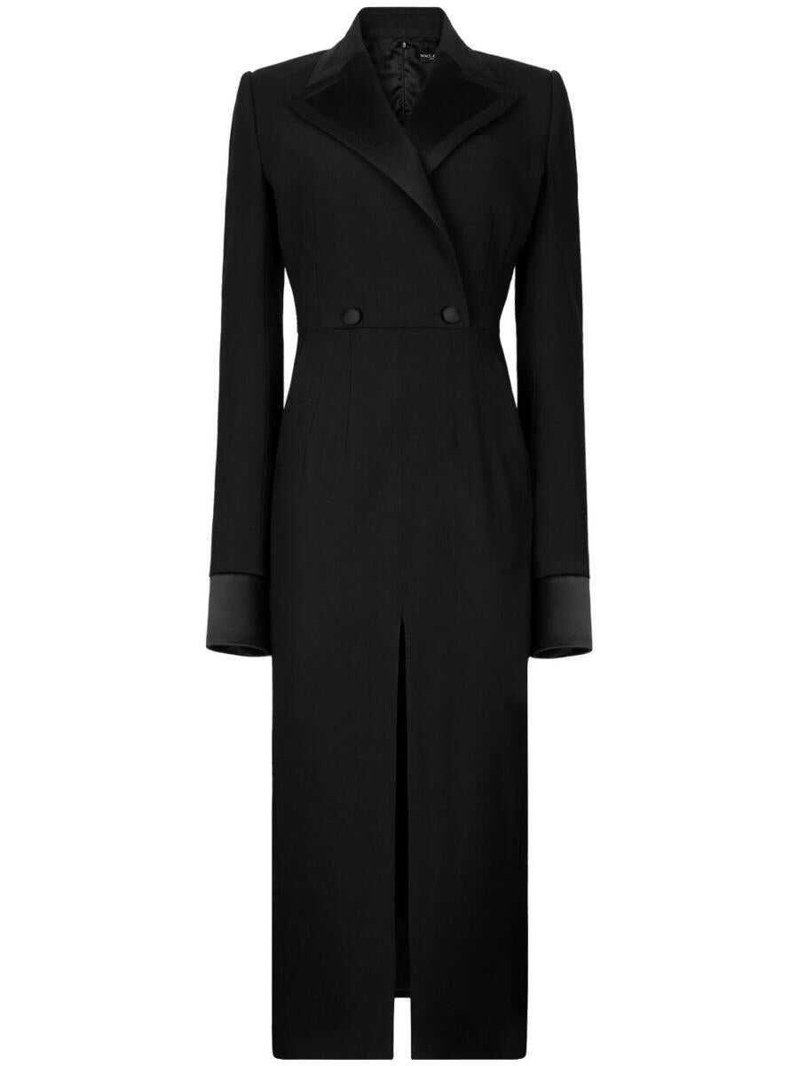 double-breasted midi dress from DOLCE & GABBANA featuring black, virgin wool-silk blend, classic collar, double-breasted button fastening, front slit, long sleeves, buttoned cuffs, knee-length and straight hem.