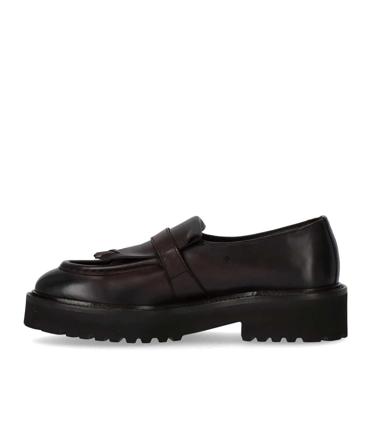 Decò loafer by Doucal's in brown leather with fringe and buckle on the front. Leather interior and insole. Brown rubber sole with treaded bottom, height 4 cm.
