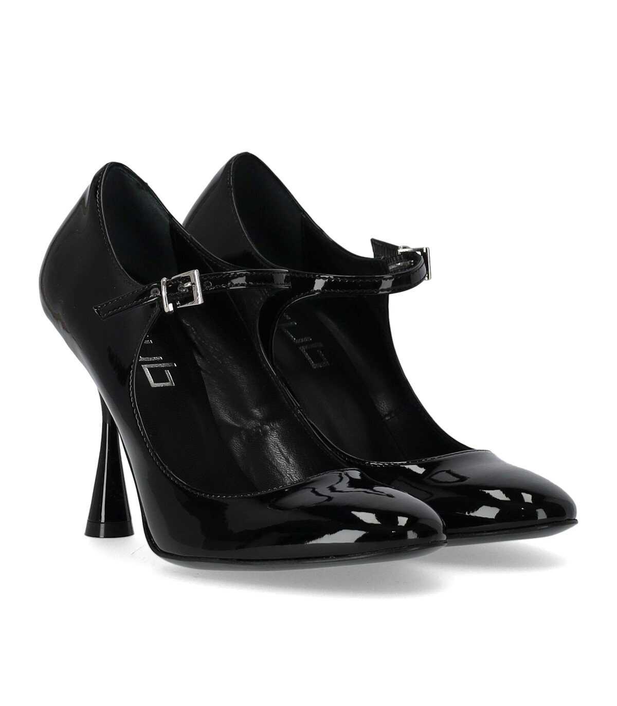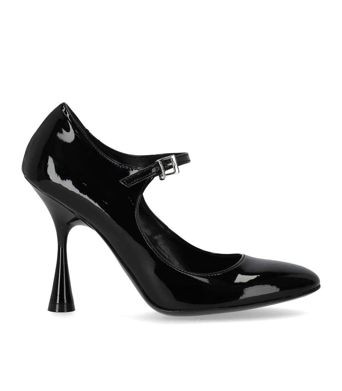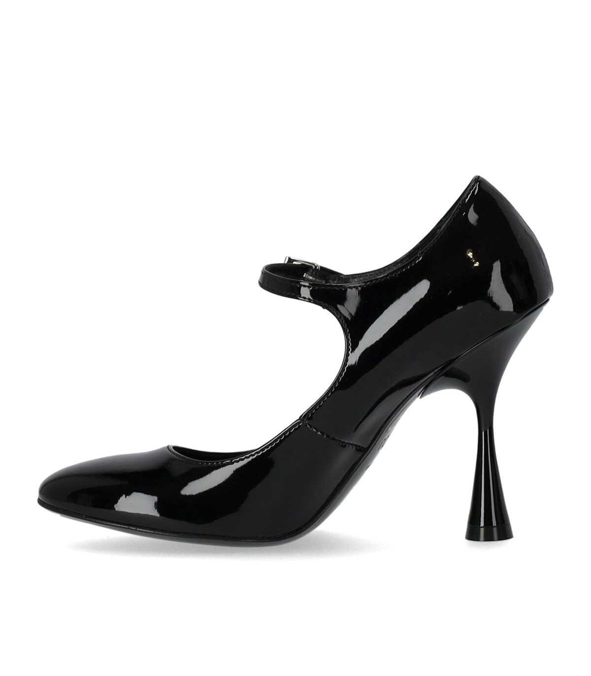 Mary Jane Carli pumps in black patent leather with a rounded toe. Buckle closure and leather insole. Leather sole with a spool heel, height 10 cm.