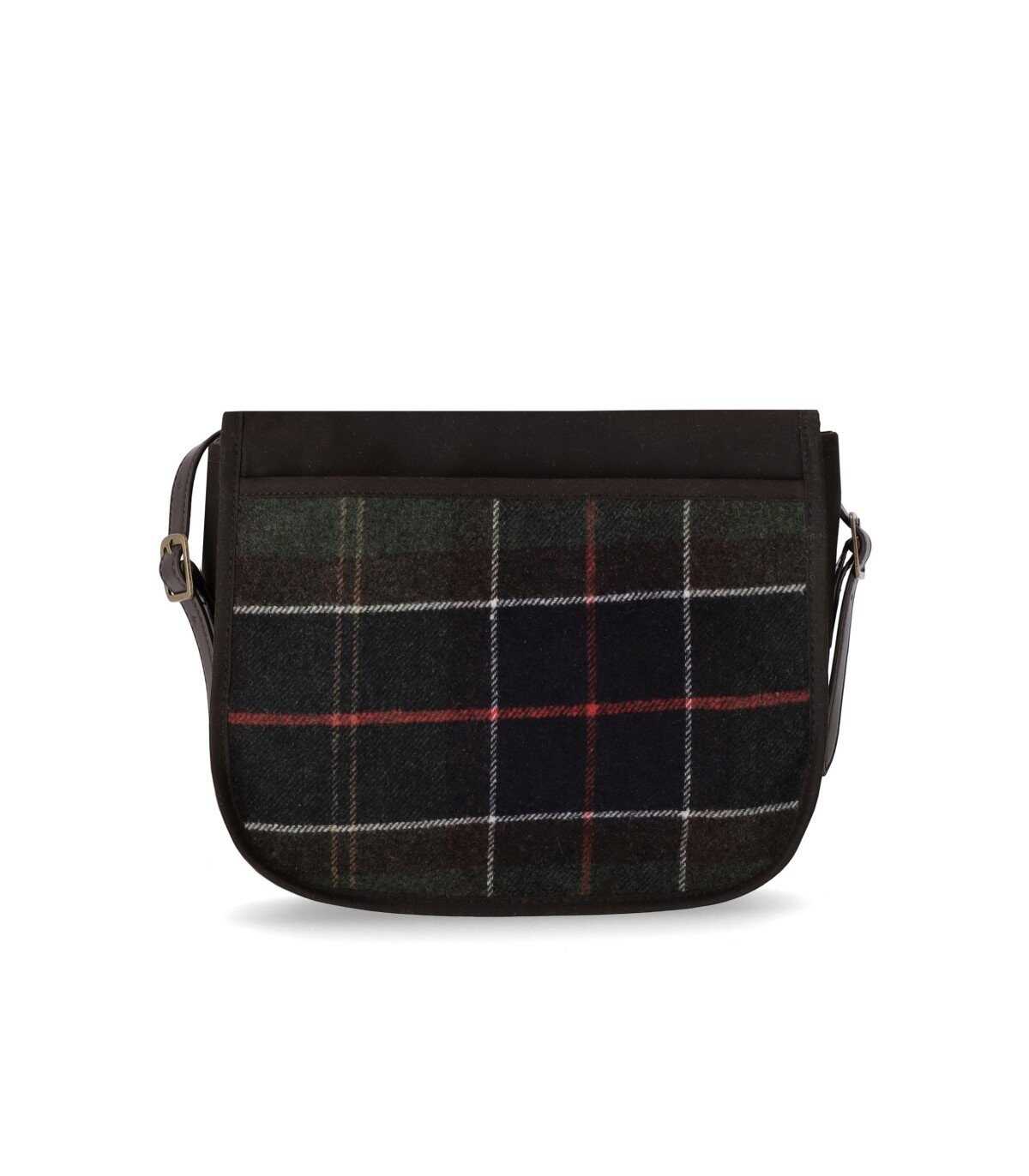 Barbour's Whitley shoulder bag is made of brown nylon with wool inserts in Barbour's iconic tartan pattern. It has a lined interior, front logo, and strap and buckle closure. The bag features an adjustable fabric shoulder strap, and measures 26x22x7 cm.