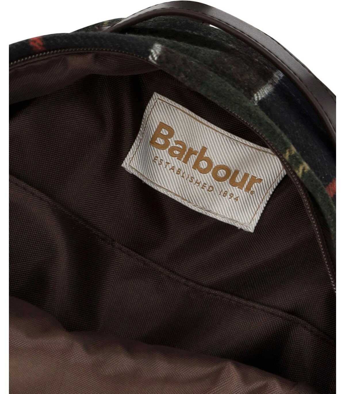 Barbour's Caley backpack made of mixed wool with tartan pattern in shades of green and blue. Compartments closed by zipper, front logo label and adjustable straps. Details in gold metal. Measures 27x22x12 cm.