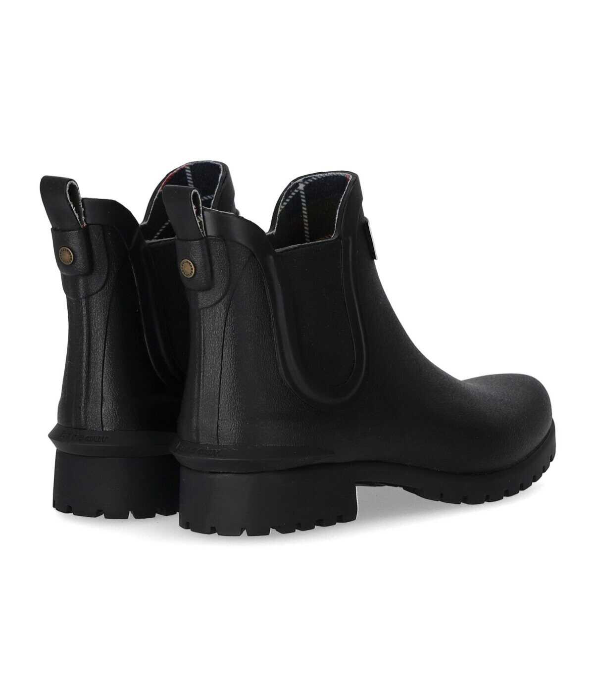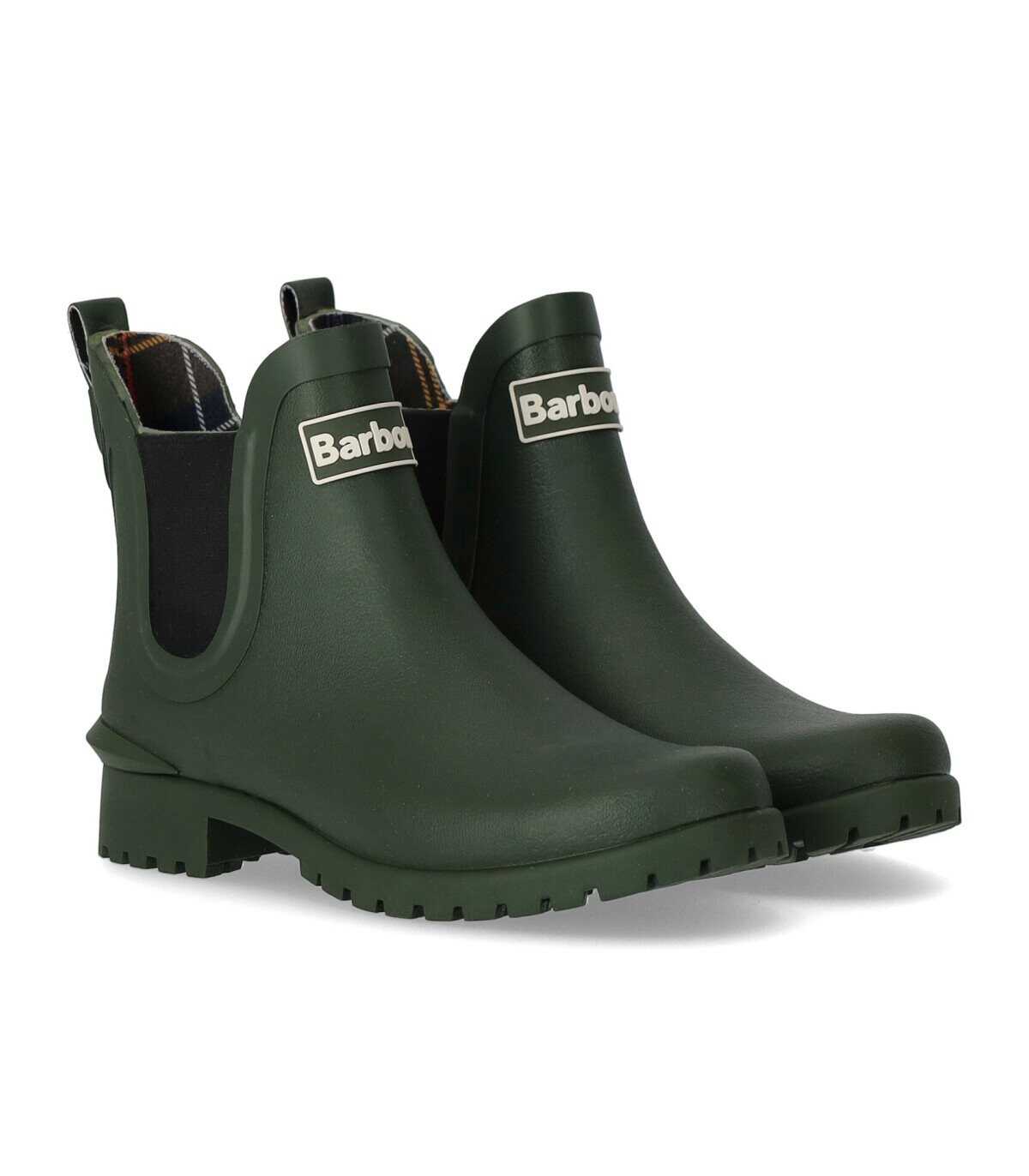 Barbour's Wilton Chelsea boot is made of olive green rubber, with elastic bands on the sides and a contrasting logo patch on the front. It has a tartan pattern lining and a fabric insole. The boot has a rubber sole with a height of 3 cm. The upper part is made of 55% rubber and 45% other fibers. The lining is 100% polyester.