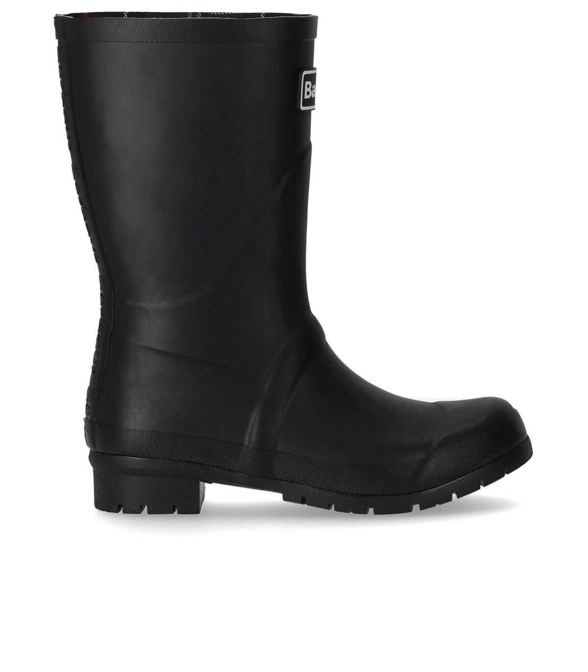 Barbour's Banbury Wellington boot made in black rubber. Contrasting logo patch on the front, tartan pattern lining, and fabric insole. Embossed logo detail on the back. Rubber sole, height 3 cm. Upper: 55% rubber, 45% other fibers. Lining: 100% cotton.