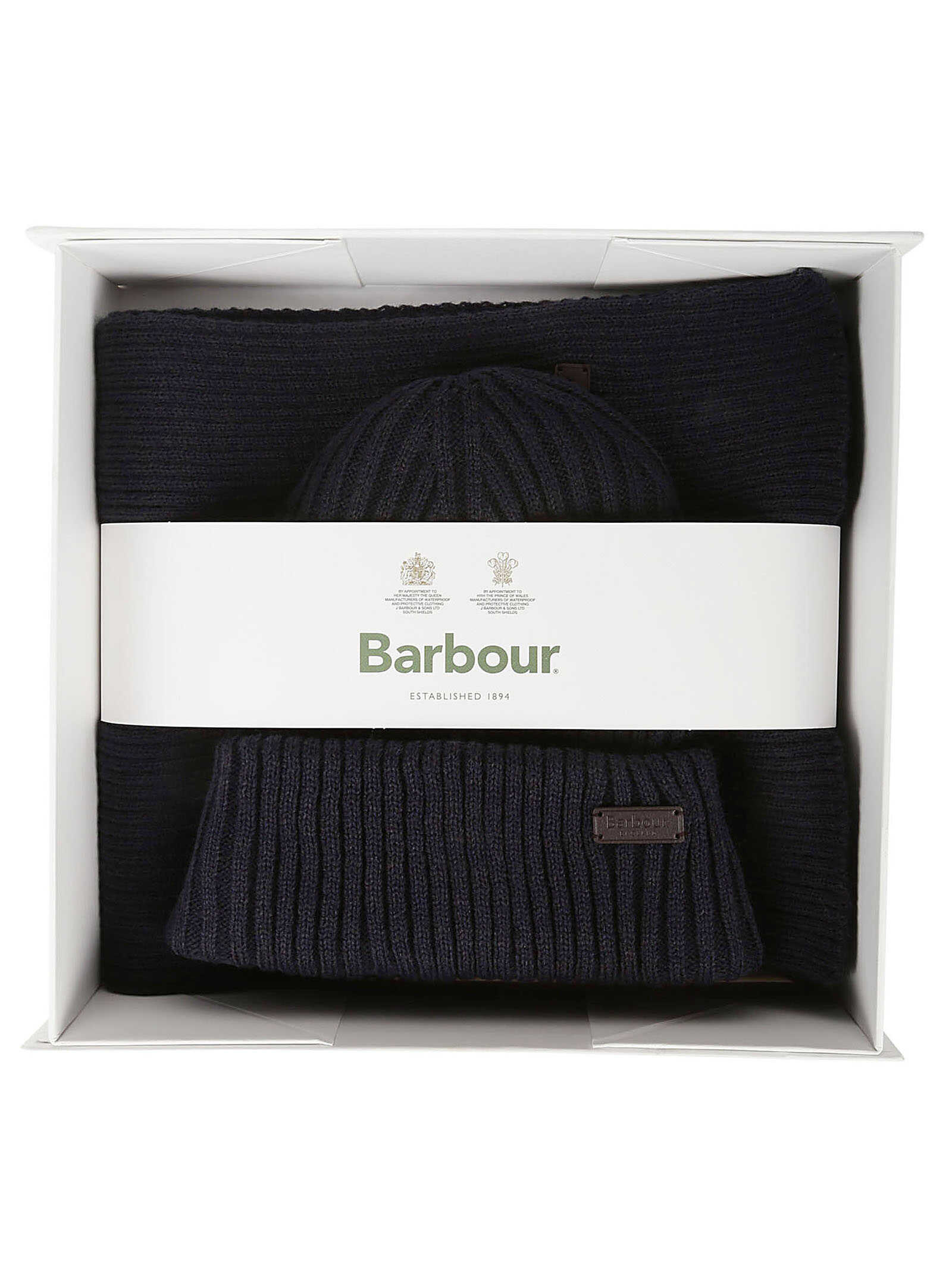 `BARBOUR ribbed beanie with a turned-up hem and a matching scarf, 100% acrylic, Barbour England embossed label.`
