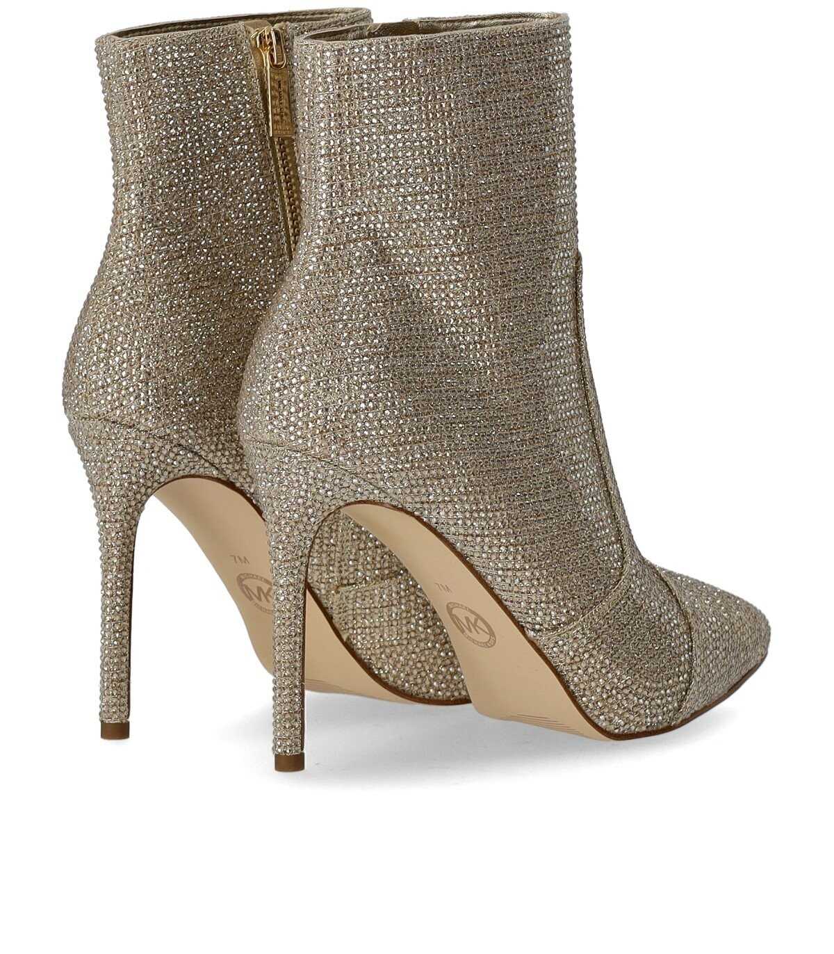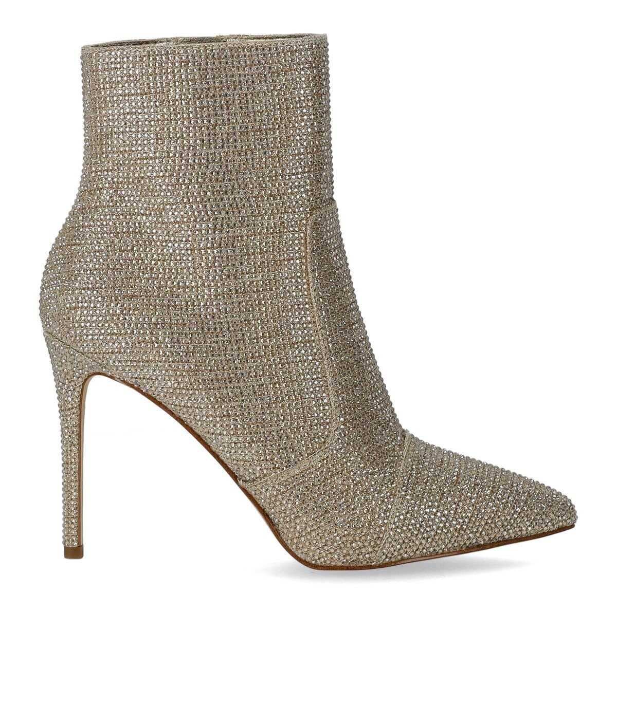 Ankle boot made of leather covered with gold rhinestones and golden side zip closure. Rubber sole with stiletto heel, height 10 cm.