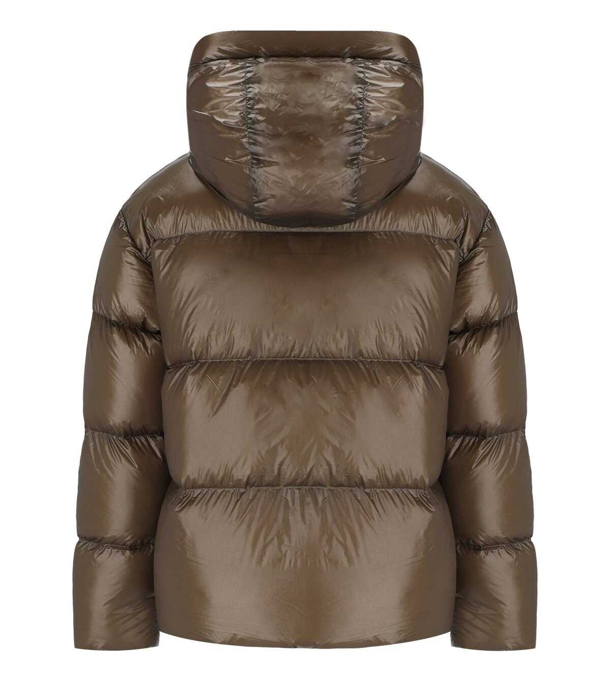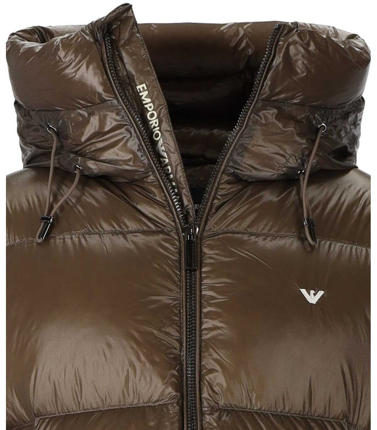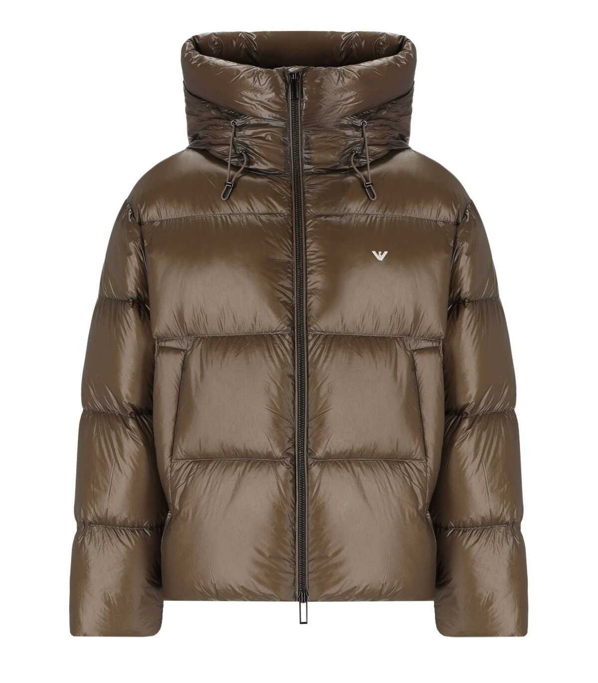 Emporio Armani down jacket made of mud-colored nylon, waterproof and filled with duck down. Embroidered logo on the chest, maxi hood with adjustable drawstring and contrasting logo print on the lacing. Front zip pockets, internal security pockets and drawstring at the bottom to adjust the fit. Double slider zip closure.
