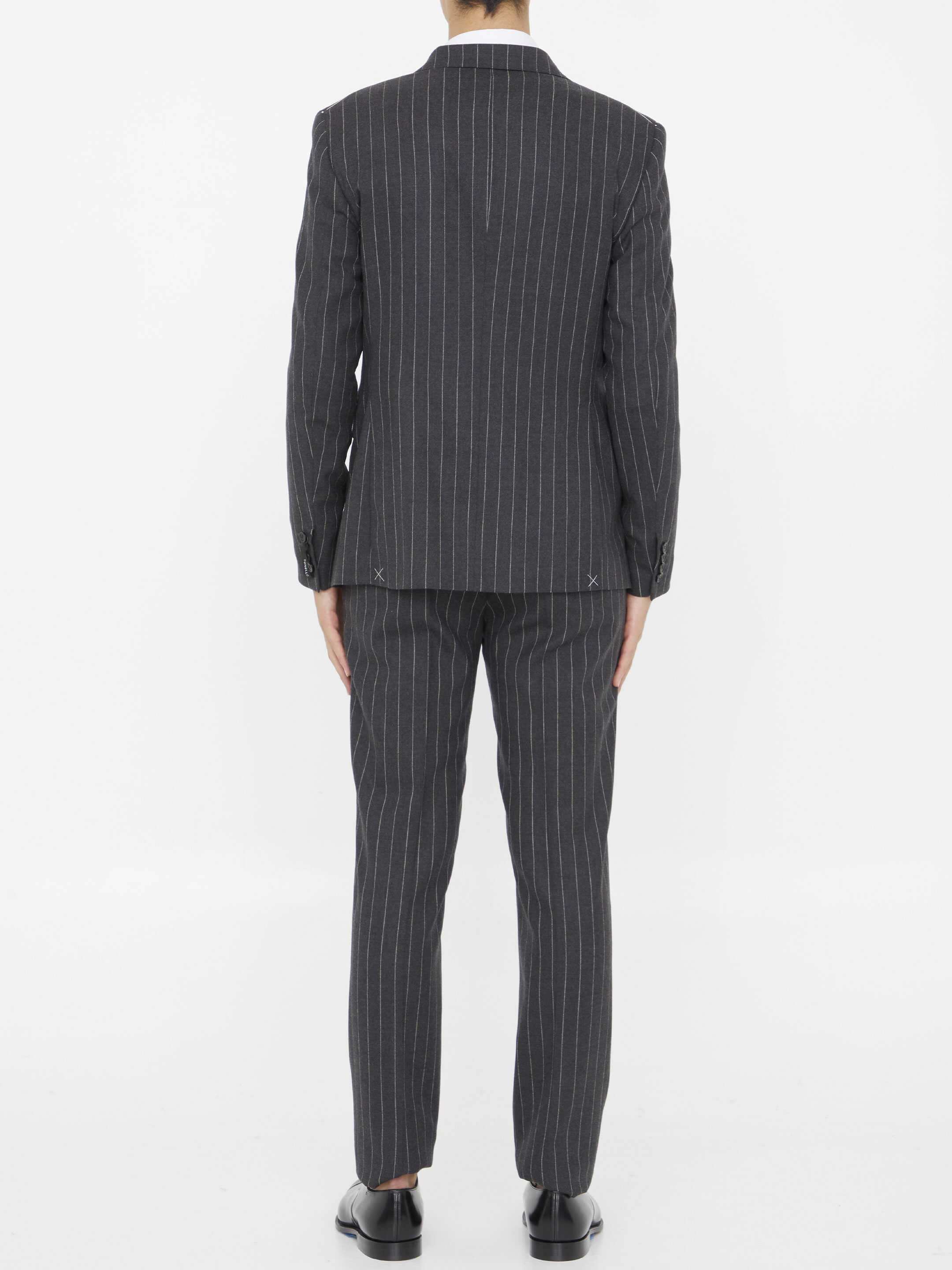 Two-piece suit in grey pinstripe virgin wool. Jacket with classic lapels, double-breasted closure, two front flap pockets, a welt pocket on chest and buttoned cuffs. Trousers with zip, button and hook-and-eye closure, two side welt pockets, two rear welt pockets and belt loops. Regular fit.